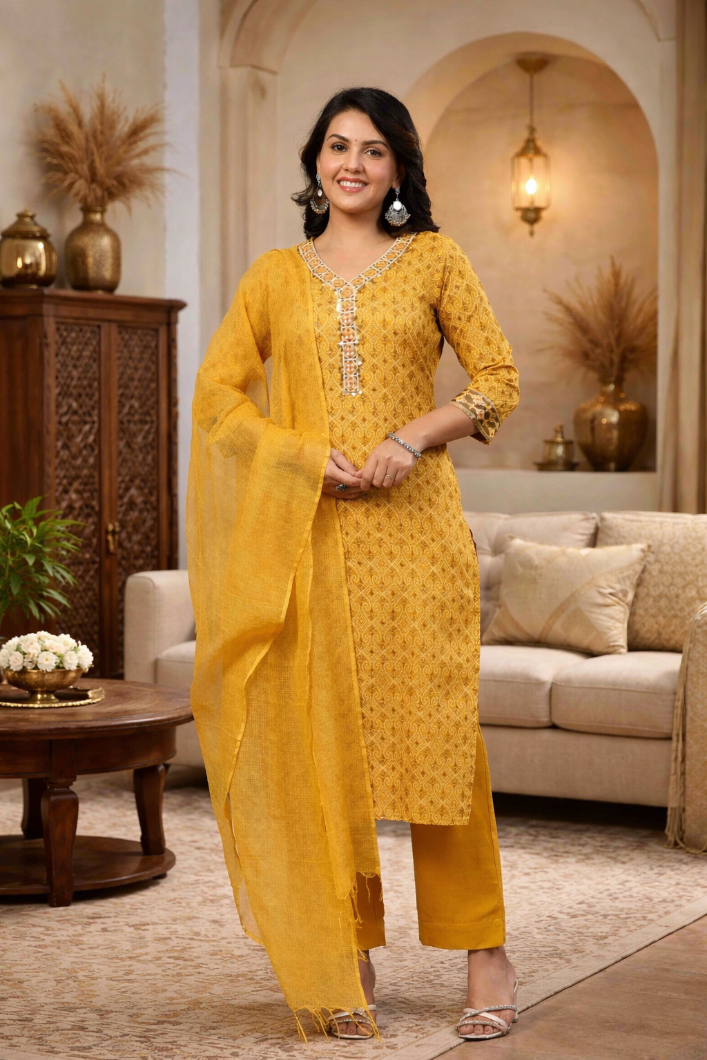 Women's Yellow Cotton Fabric Printed Suit Set | Ethnic Straight Kurta with Pants & Dupatta