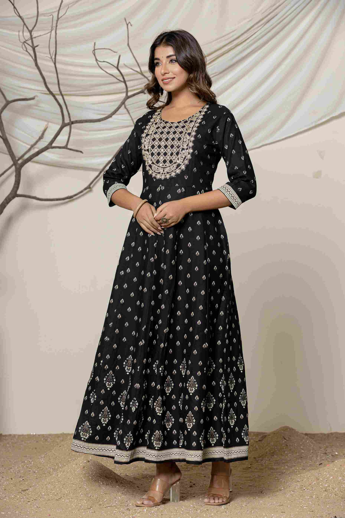 Women's Cotton Black Embroided Dress I Ethnic Anarkali Dress with Sequin & Zari work