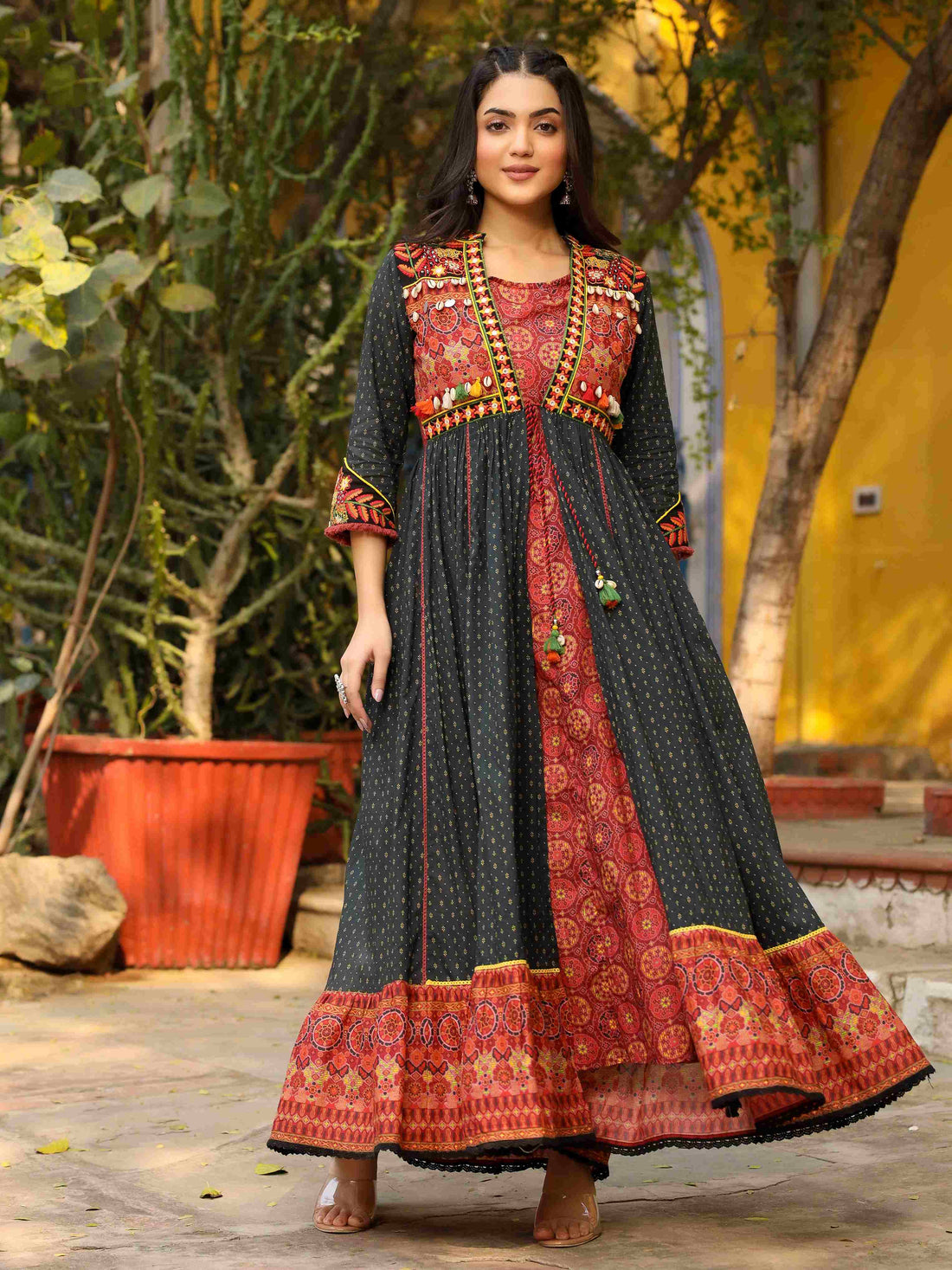 Make a striking statement in this women's black embroidered cotton Anarkali dress, crafted from breathable...
