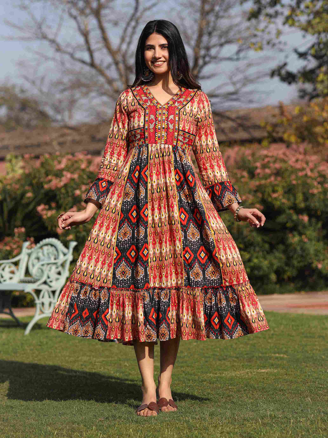 Women's Cotton Rust Printed Dress I Ethnic long Flared Dress