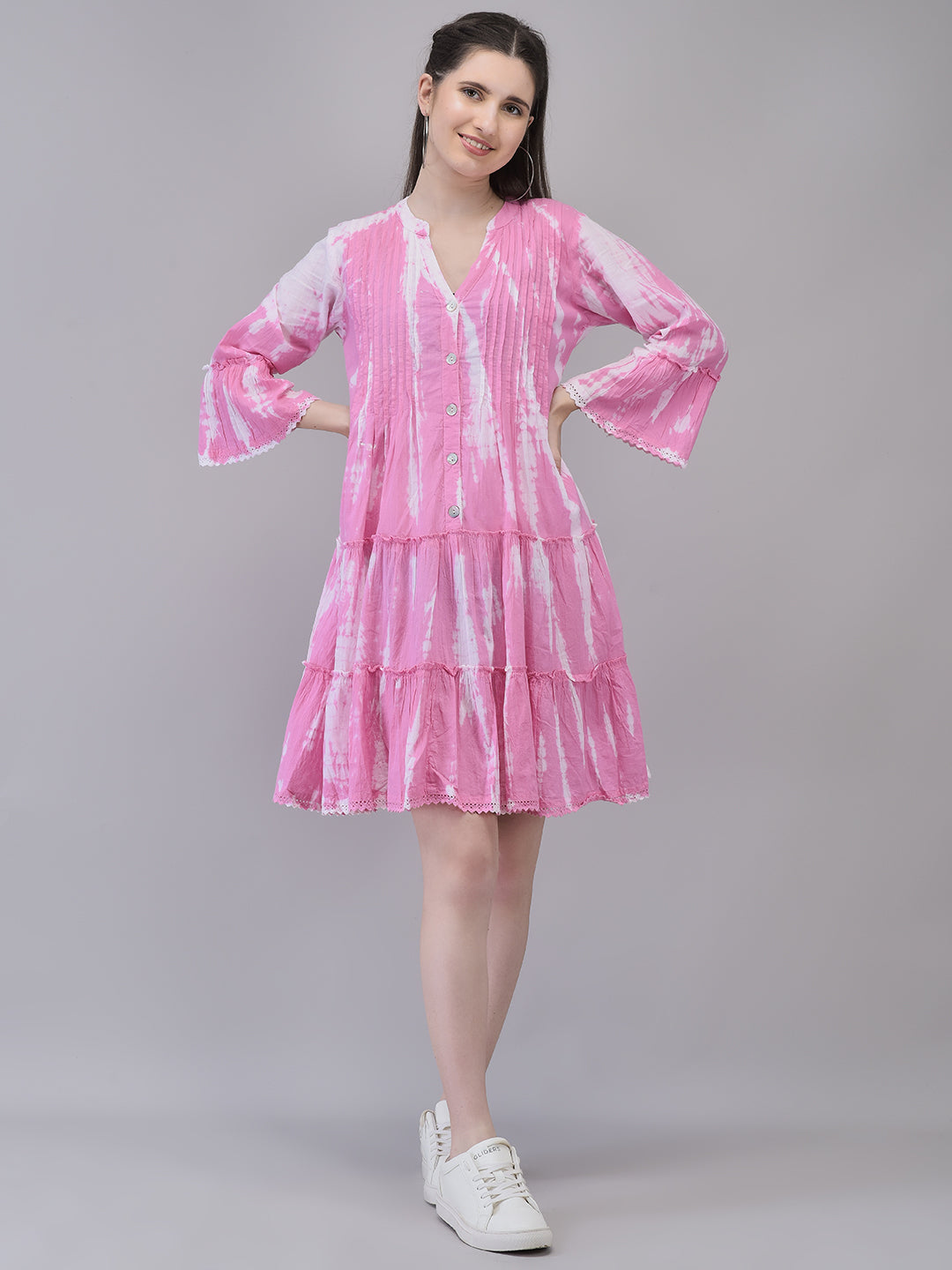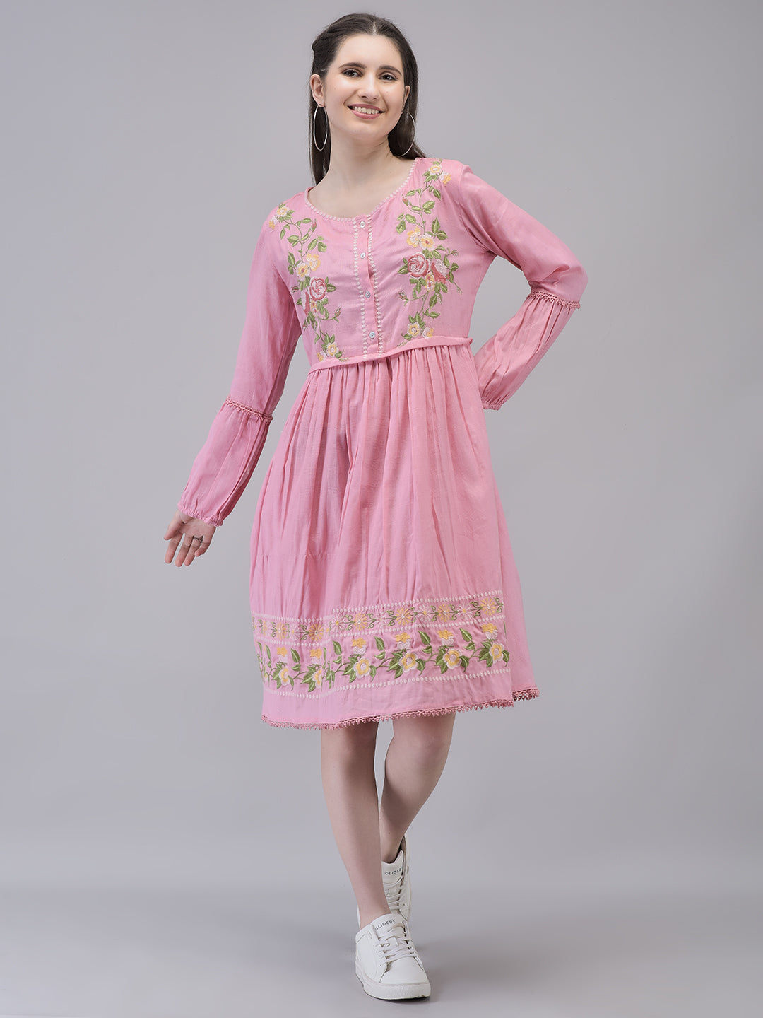 Women's Cotton Pink Printed Dress | Embroidered Midi Dress Full Sleeves
