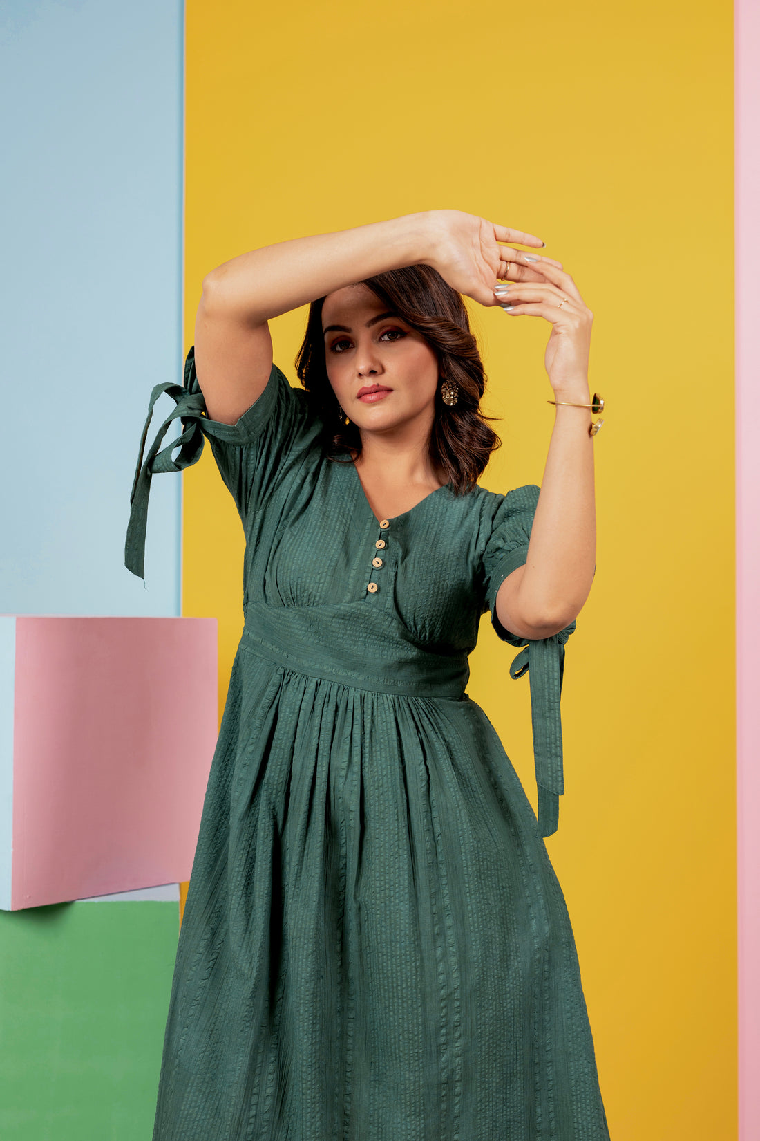 Women's Cotton Green Dress | Plain Ethnic Midi Dress