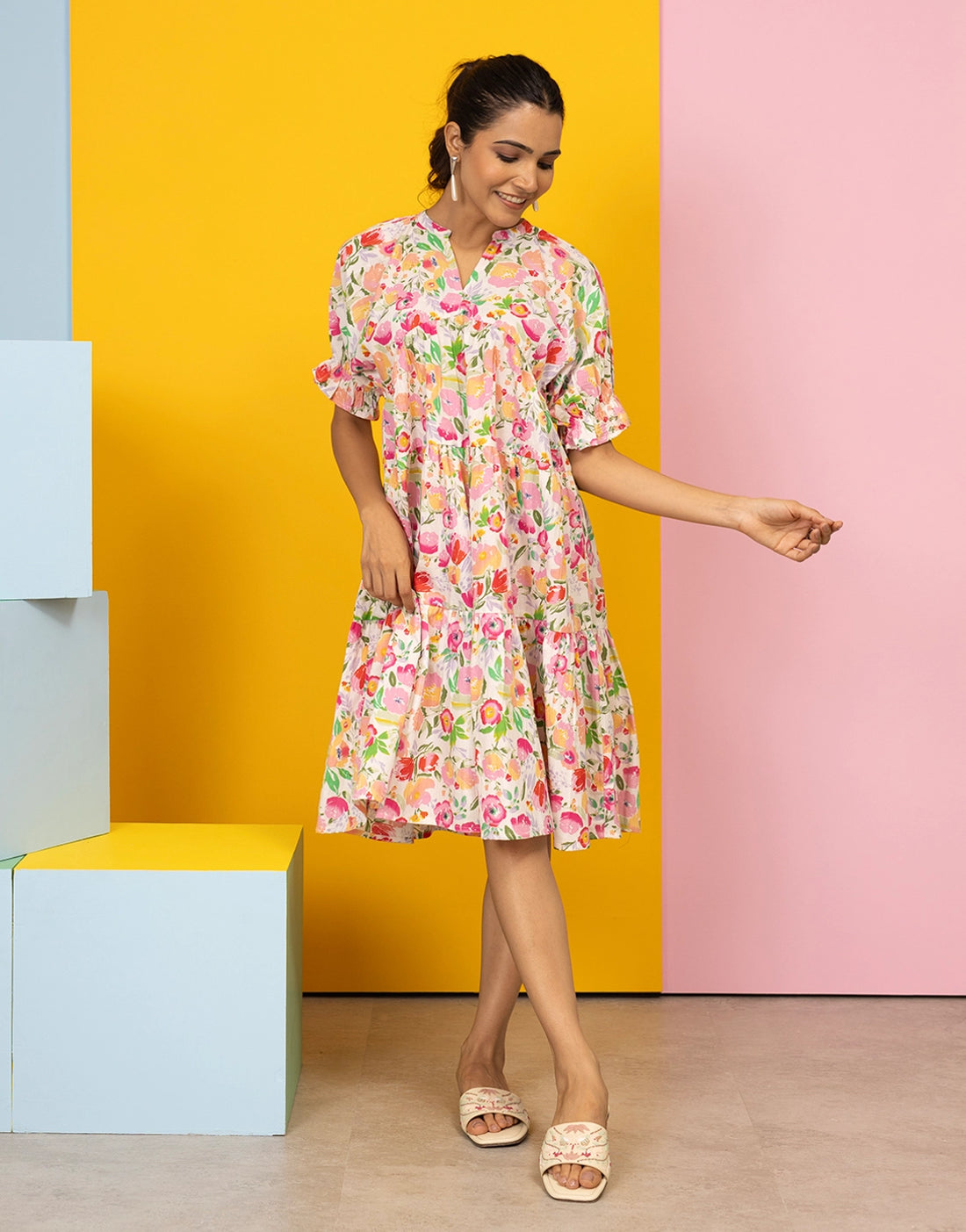 Embrace effortless charm with this women's cotton off-white floral printed midi dress, perfect for sunny...