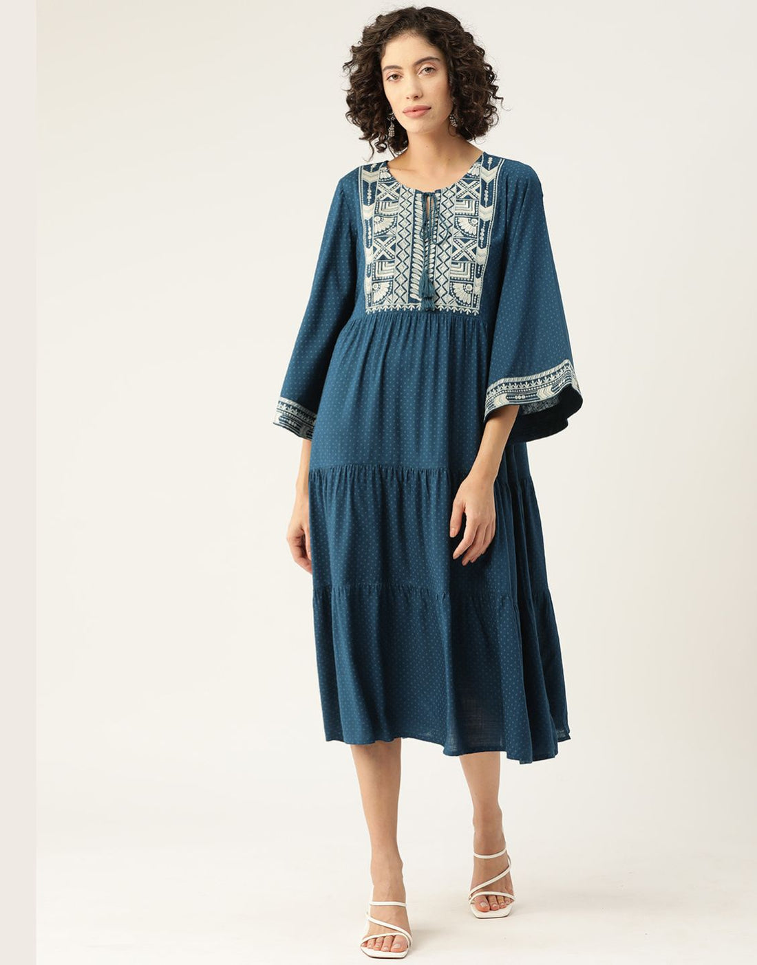 Women's Rayon Blue Thread Embroided Dress | Flared Midi Dress