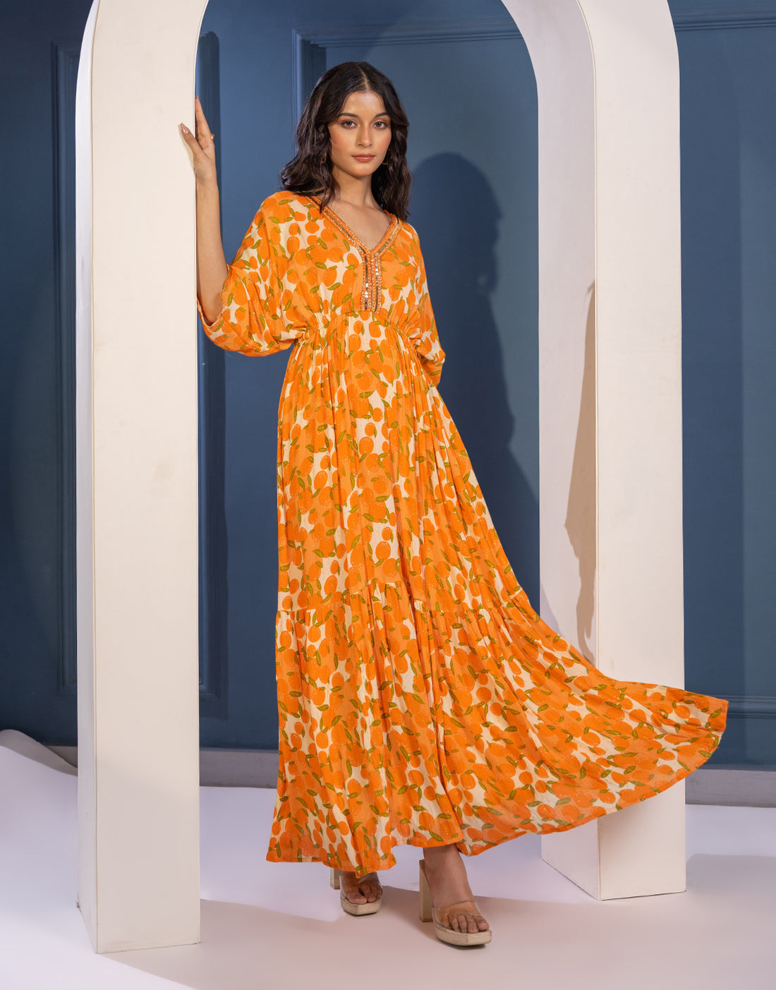 Women's Georget Yellow Printed Dress Printed Maxi Dress with Beads Embroidery on neck