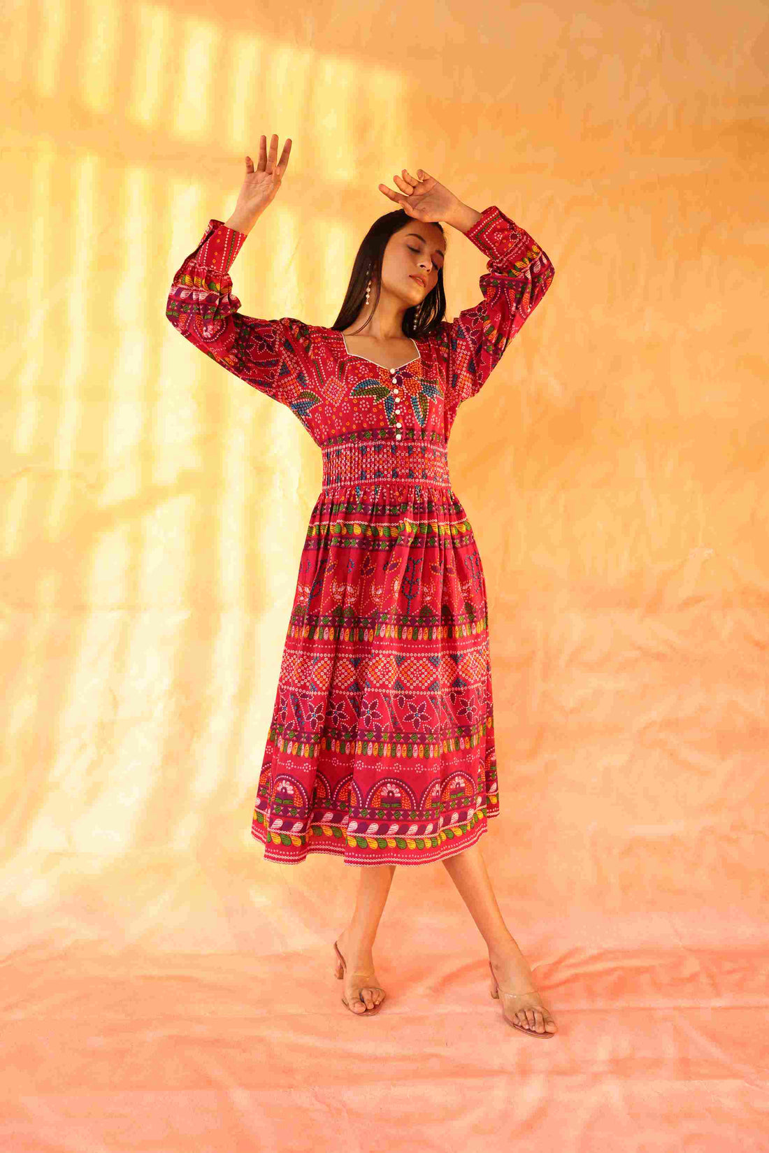 Women's Cotton Red Jaipuri Printed Dress | Ethnic Flared Midi Dress