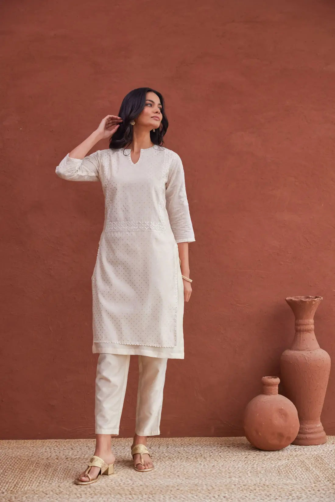 Women's Off white Linen Fabric Pakistani Kurta With Pants