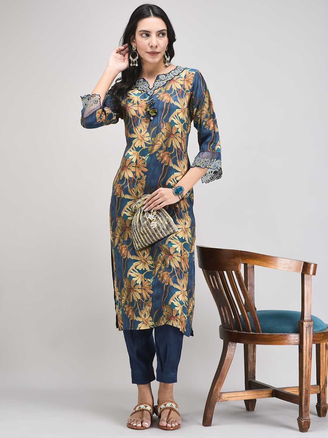 Turn heads with this stunning Floral Elegance Kurti, featuring a rich navy base adorned with...