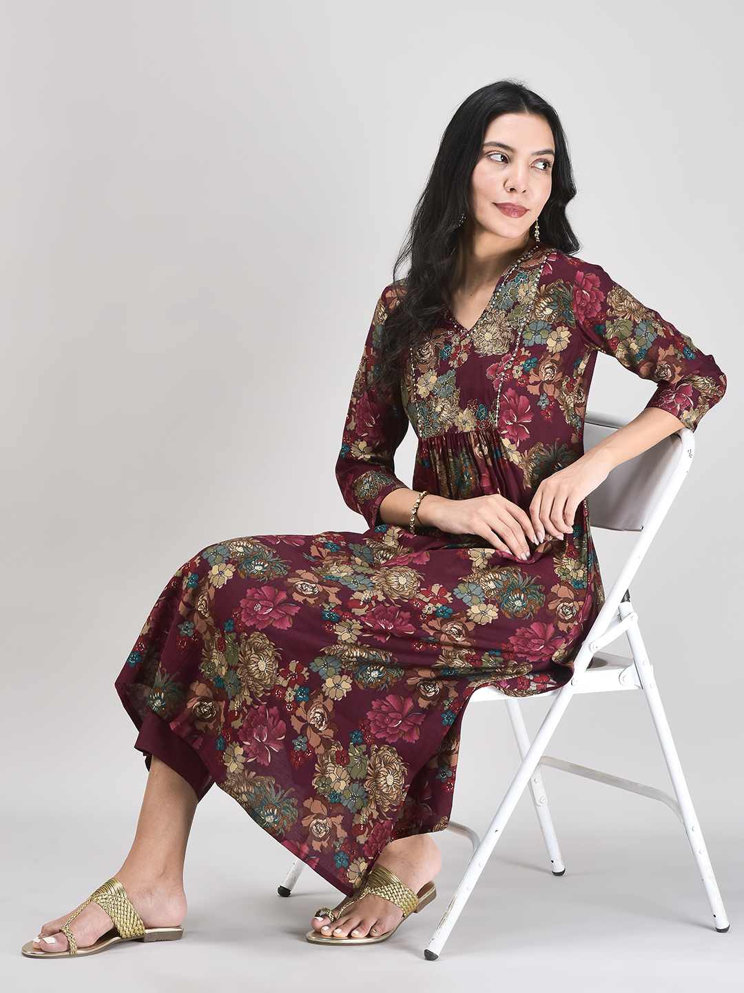 Turn heads wherever you go with this captivating Maroon Floral Printed Muslin Fabric Kurta Set....