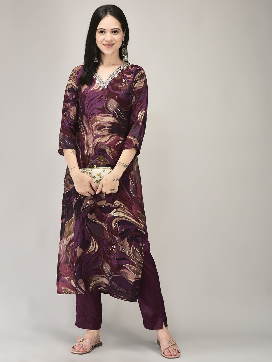 Elevate your ethnic style with this elegant wine swirl print kurta set, designed to make...