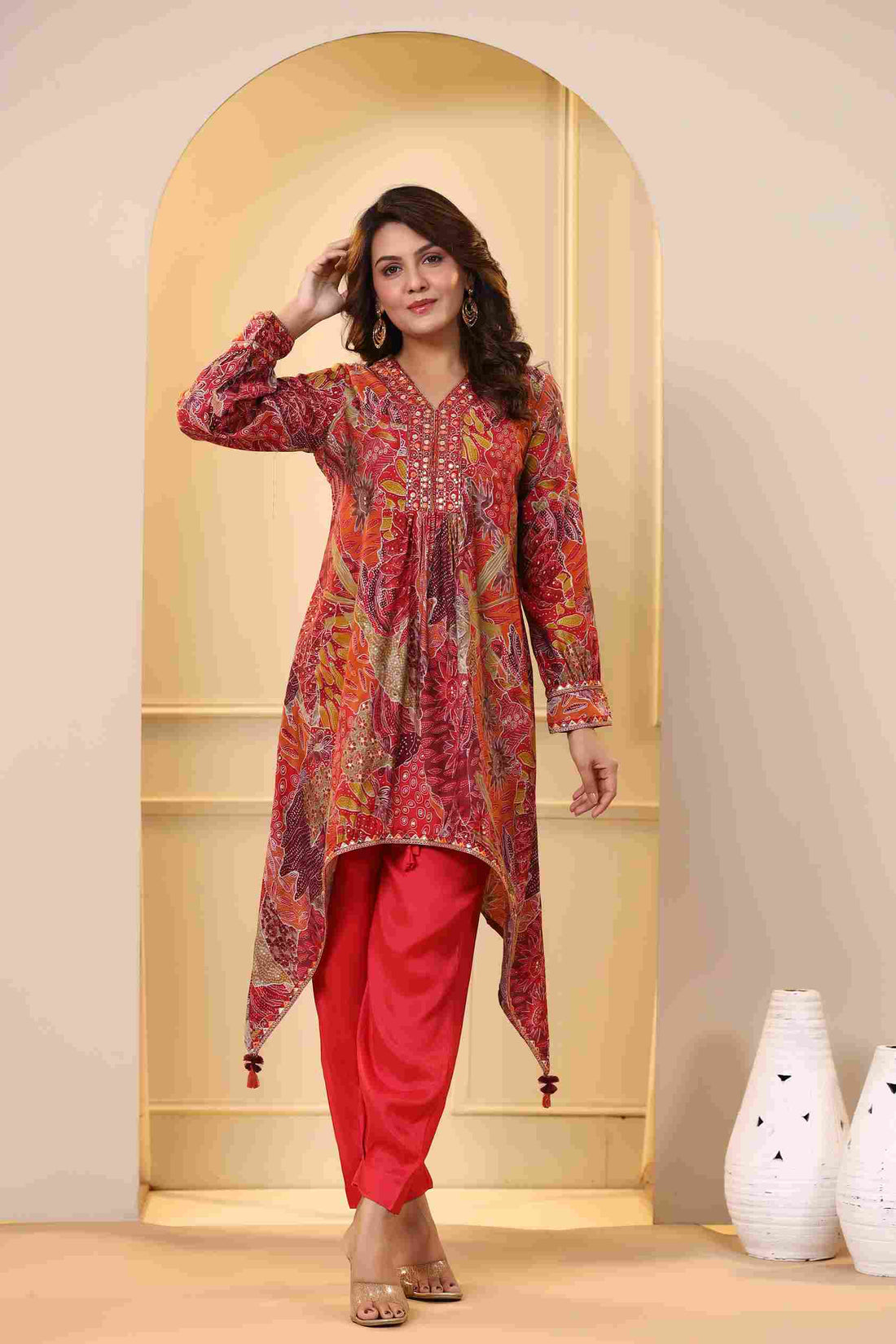 Women's Crimson Red Modal Fabric Asymmetrical Hemline Kurta with Pants