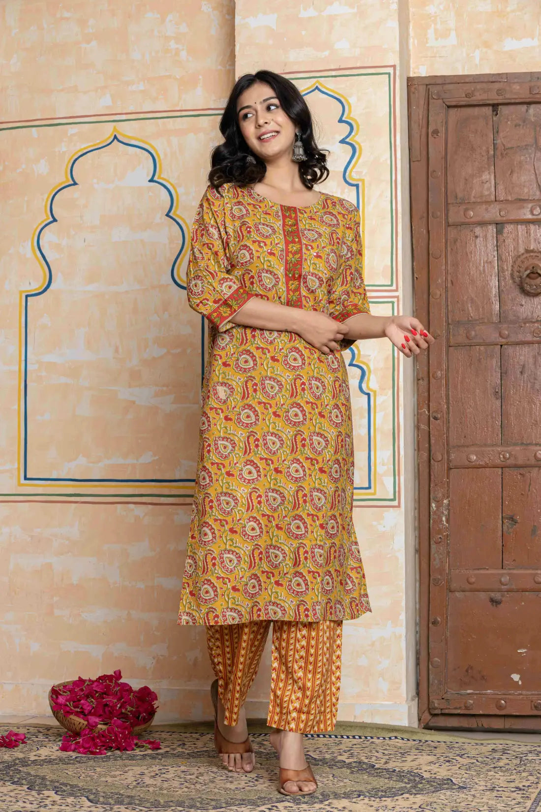 Add a touch of ethnic elegance to your wardrobe with this mustard kurta set featuring...