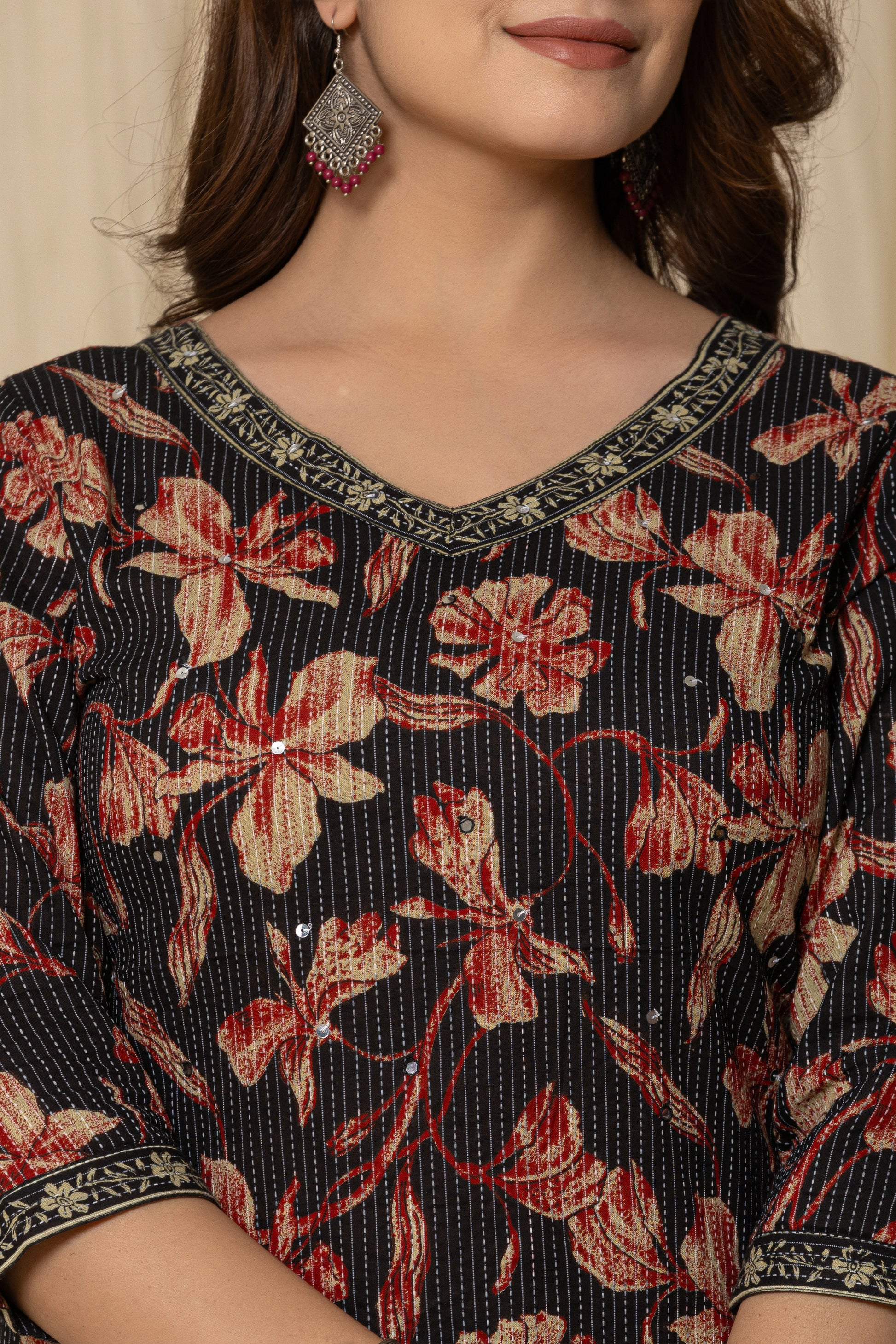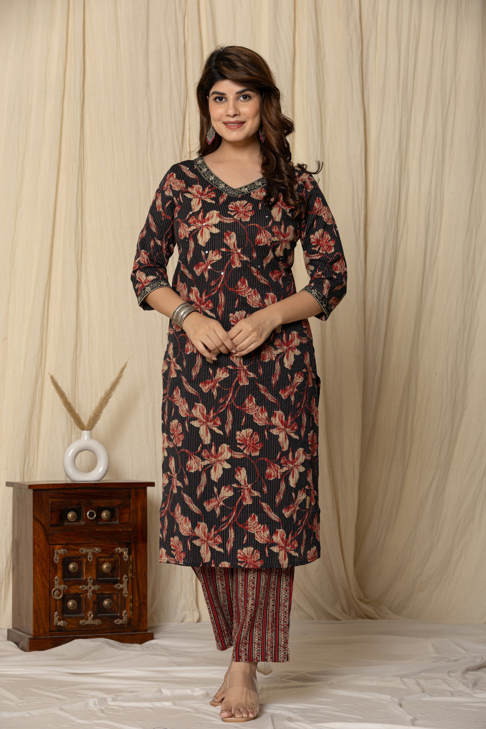 Turn heads with this stunning Floral Elegance Kurti, featuring a rich navy base adorned with vibrant red and peach blooms. The subtle vertical stripes add a touch of sophistication, while the intricately embellished neckline and sleeve borders enhance its traditional charm. Paired with contrasting striped trousers, this outfit perfectly blends classic grace with modern flair. Ideal for casual gatherings or festive occasions—effortlessly elegant, endlessly comfortable.