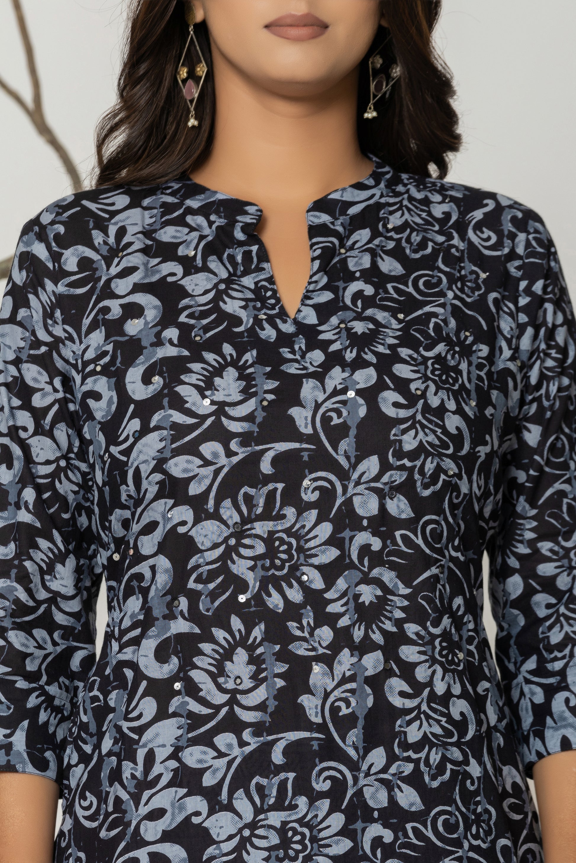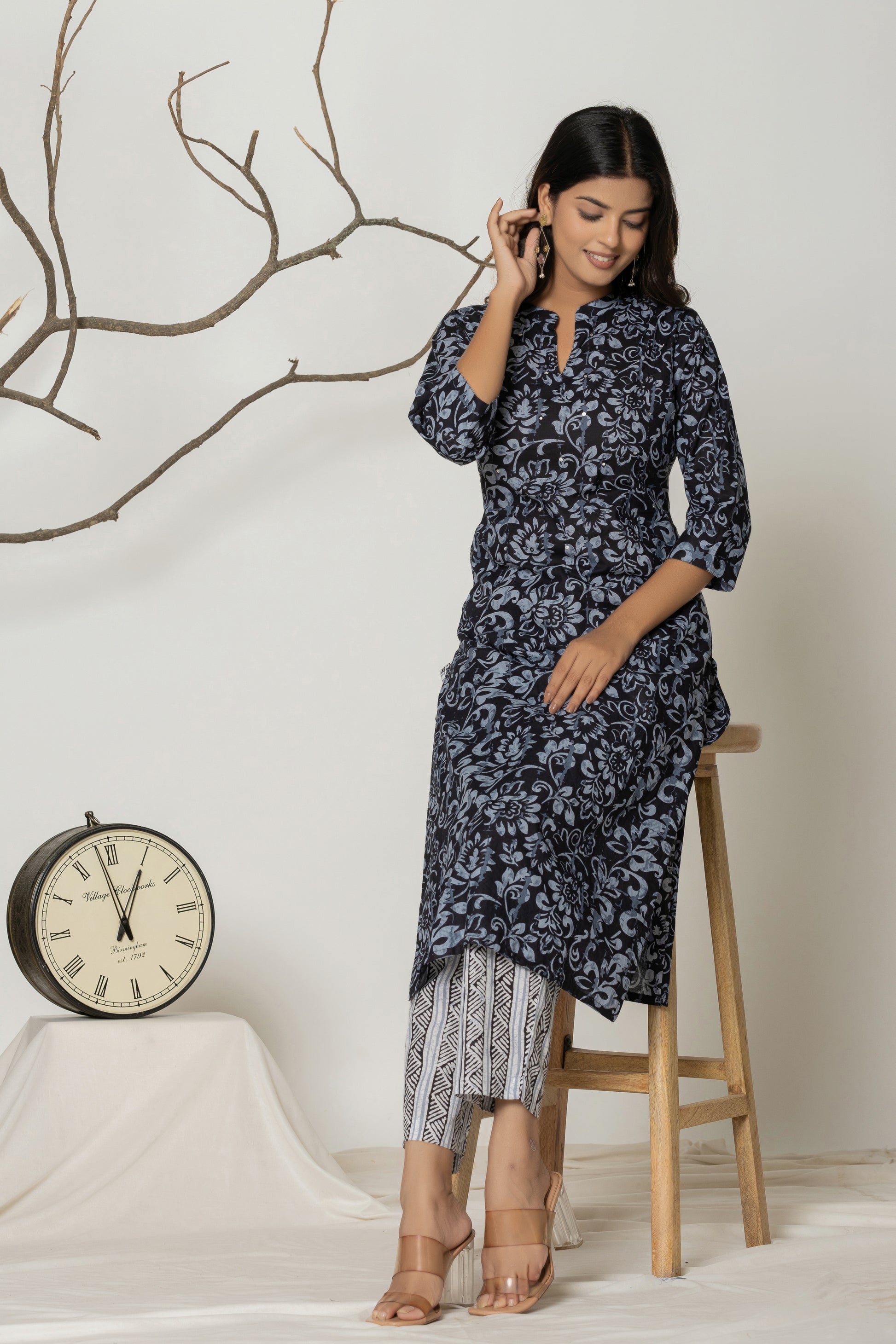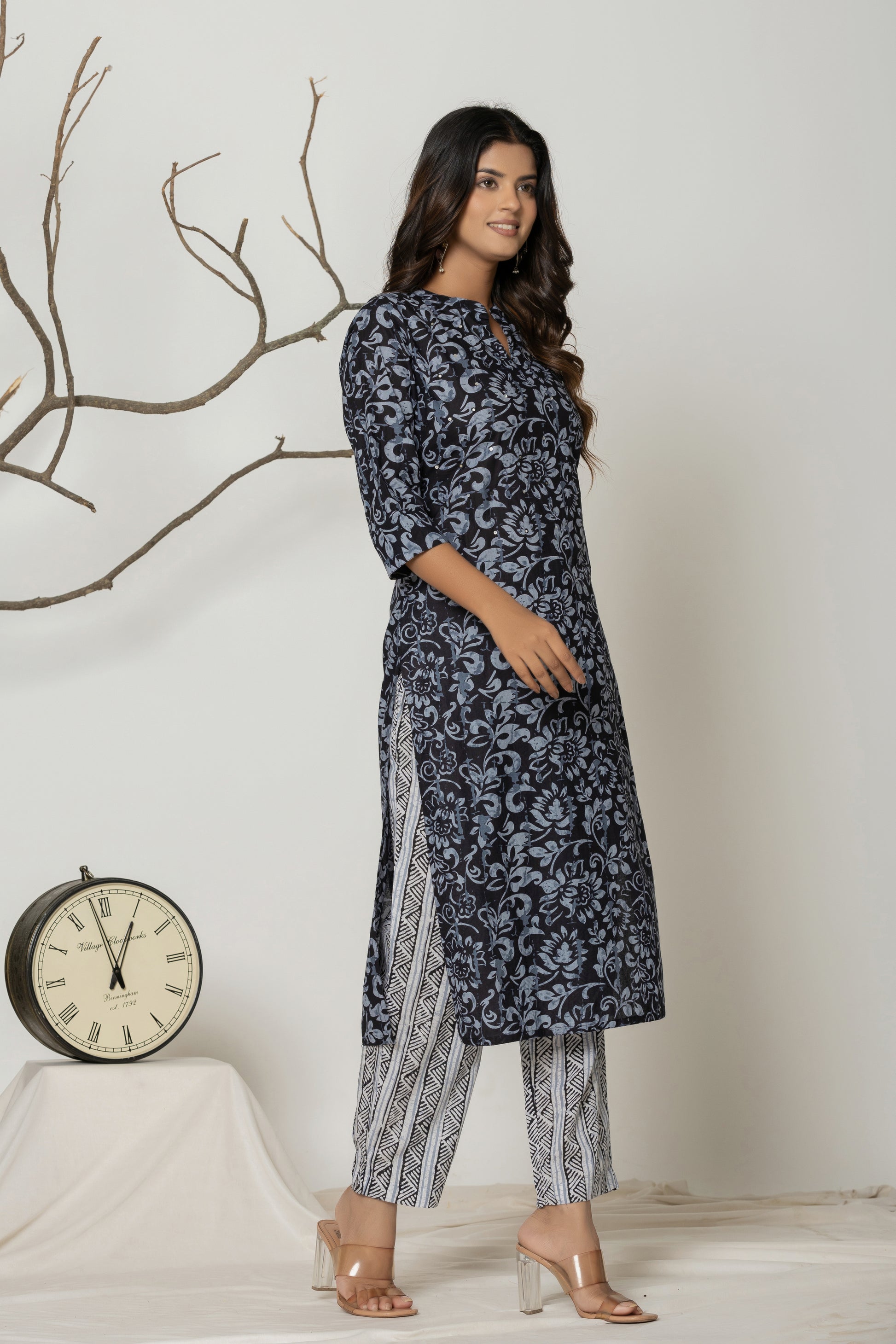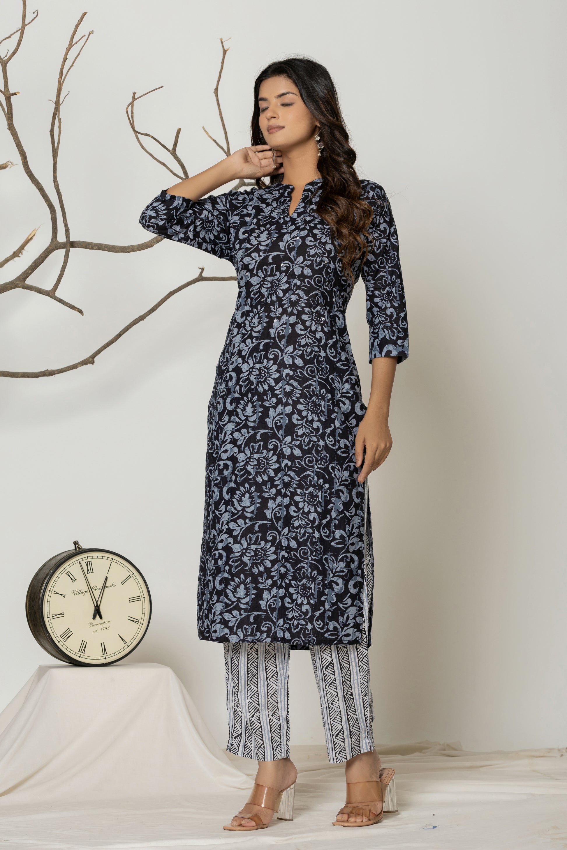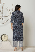 Elevate your everyday style with this elegant black floral kurta set. Crafted from soft, breathable fabric, the kurta features intricate black floral prints and a flattering straight-cut silhouette with 3/4 sleeves and a notch neckline. Paired with contrasting striped white and black printed pants, this ensemble blends traditional charm with modern grace—perfect for work, casual outings, or relaxed festivities. Comfort meets sophistication in this must-have wardrobe essential!