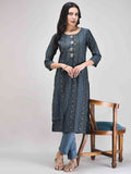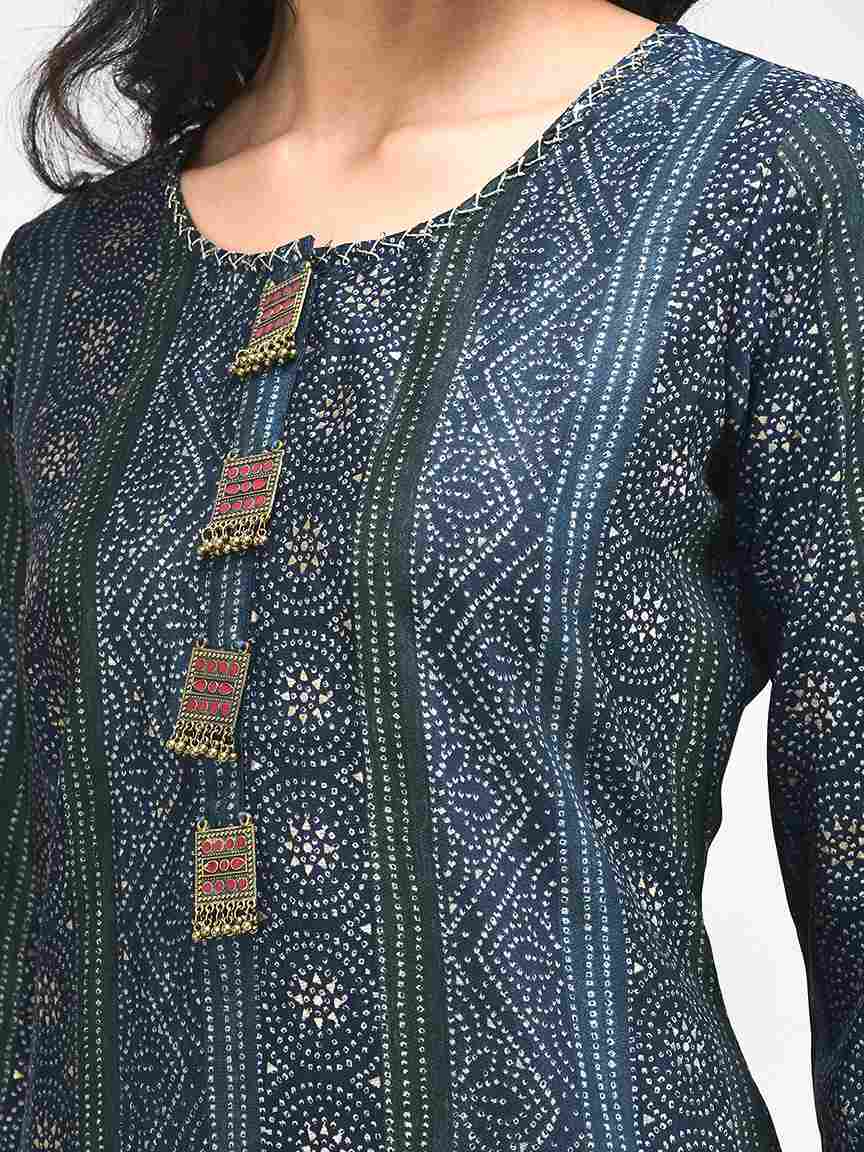 Refresh your ethnic wardrobe with this elegant blue muslin Bandhani print kurta designed in a flattering straight-fit silhouette. Crafted from lightweight muslin fabric, it features a classic round neckline, 3/4 sleeves, and traditional Bandhani-inspired prints that add a timeless charm. Pair it with denim, palazzos, or leggings for a chic everyday or semi-formal ethnic look.