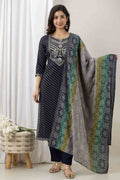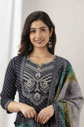 Women's Blue Muslin Fabric Suit Set | Ethnic Printed Straight Kurta with Pants & Dupatta