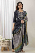 Elevate your ethnic wardrobe with this Blue Muslin Suit Set, crafted from soft, breathable muslin fabric. The straight-cut kurta features a delicate print, complemented by matching pants and a coordinating printed dupatta for a cohesive look. Ideal for casual outings, festive gatherings, or family events, the soothing blue hue and comfortable fit offer both style and ease. A versatile ensemble that seamlessly blends traditional charm with modern flair.