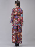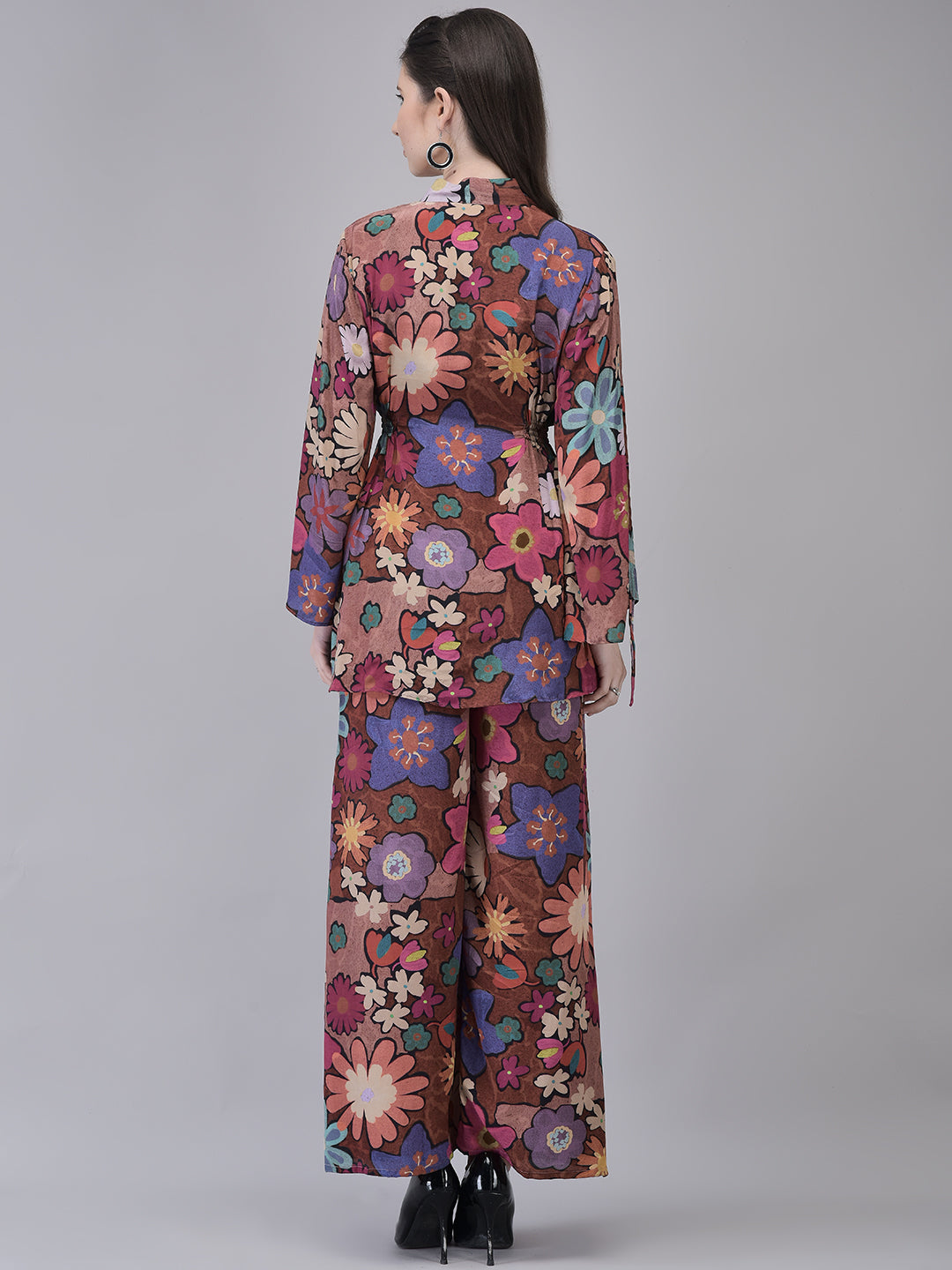 Infuse your wardrobe with a burst of vibrant style with this chic brown crape fabric floral-printed co-ord set. Designed for the modern woman who loves to make a statement, this ensemble features a flowy silhouette and eye-catching multi-color floral prints that exude confidence and charm.