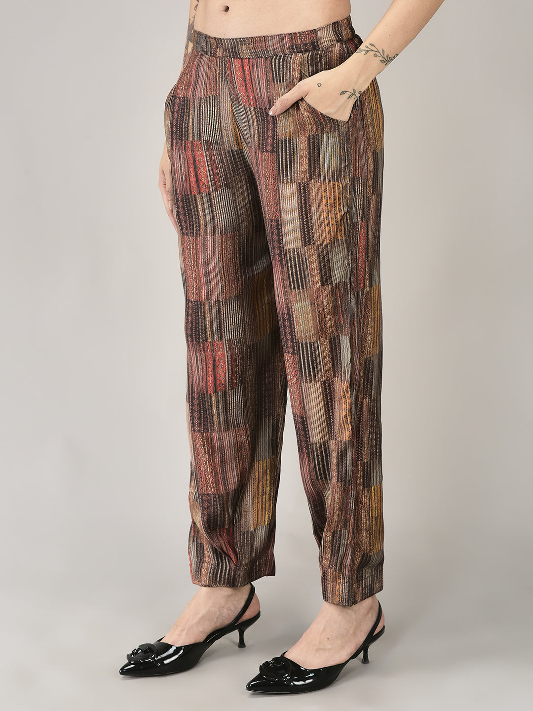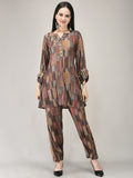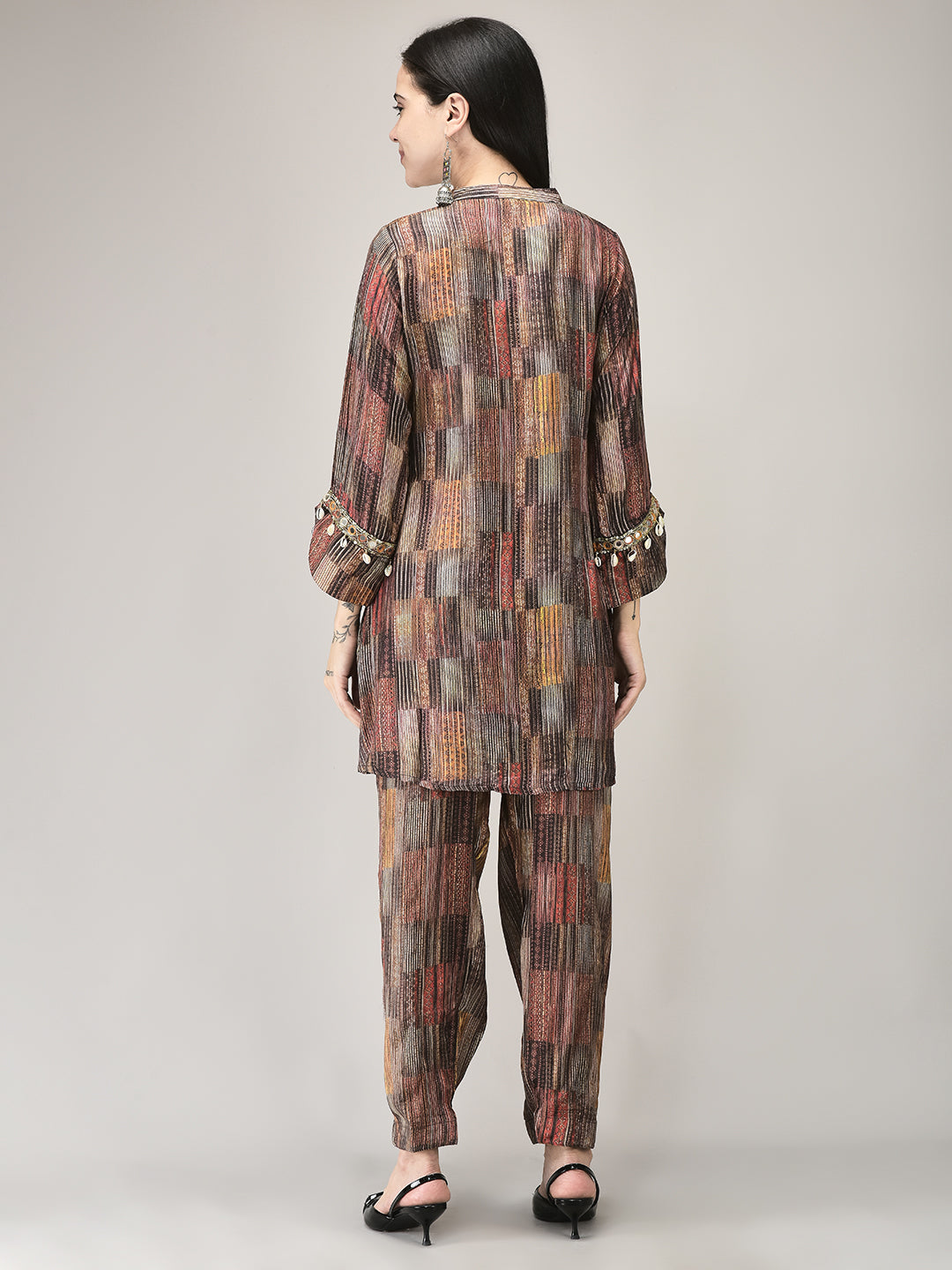 Elevate your everyday wardrobe with this sophisticated two-piece ensemble featuring a luxuriously soft brown muslin tunic paired with coordinating pants. The tunic showcases an exquisite cowrie shell embellishment that adds an artisanal touch and subtle coastal elegance. Crafted from breathable muslin fabric, this set offers exceptional comfort for all-day wear while maintaining a polished, refined appearance. Perfect for casual outings, relaxed gatherings, or layering with your favorite accessories. The natural drape of muslin ensures effortless movement, making this a versatile staple for the modern woman seeking both style and comfort.