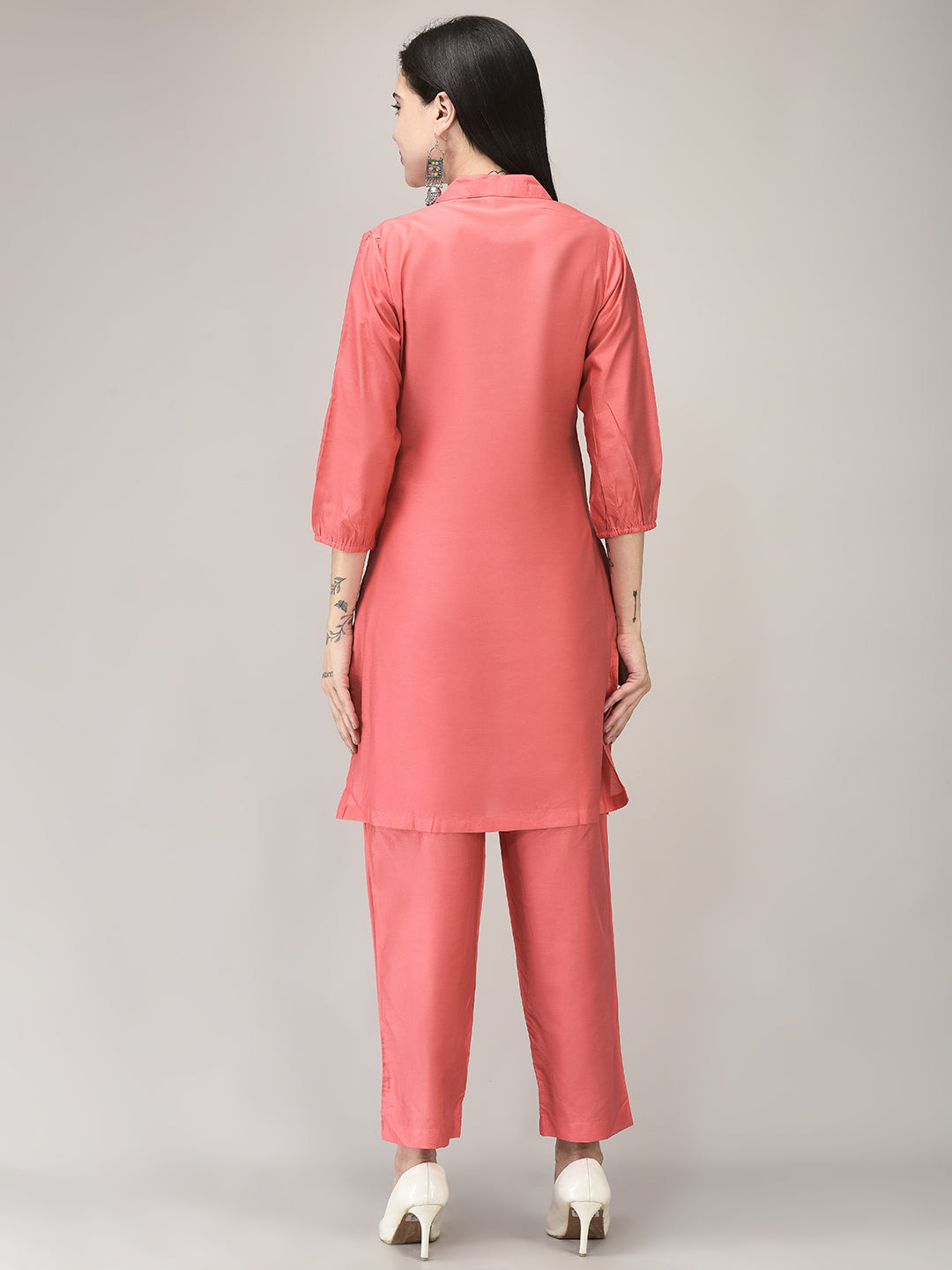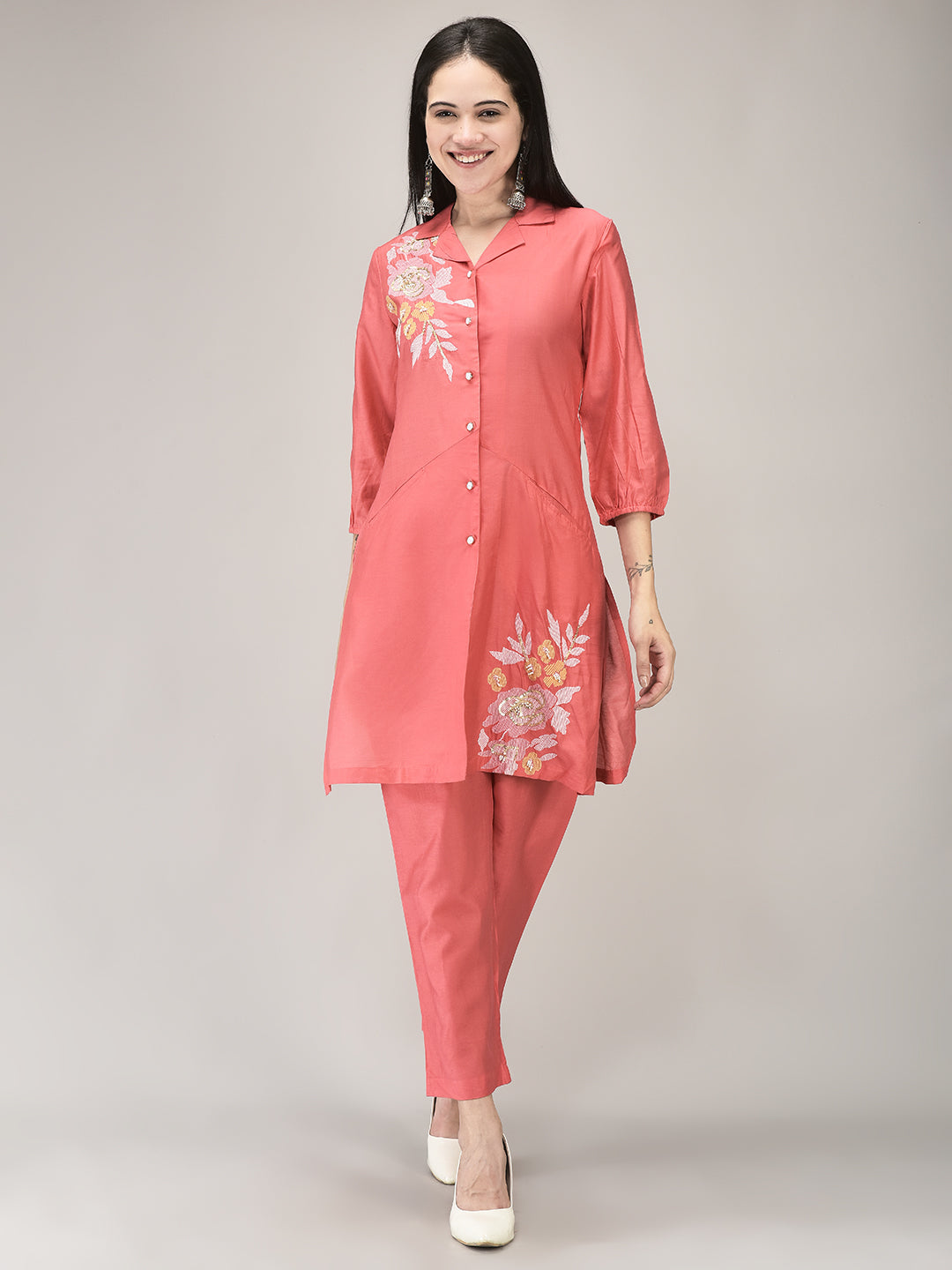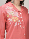 Step into effortless style with this charming coral co-ord set, featuring delicate floral embroidery on the shoulder and hem. The smart button-down front and tailored silhouette offer a polished yet relaxed look, perfect for day-to-evening wear. Crafted in a soft, breathable fabric, it’s paired with straight-cut pants for all-day comfort and grace.