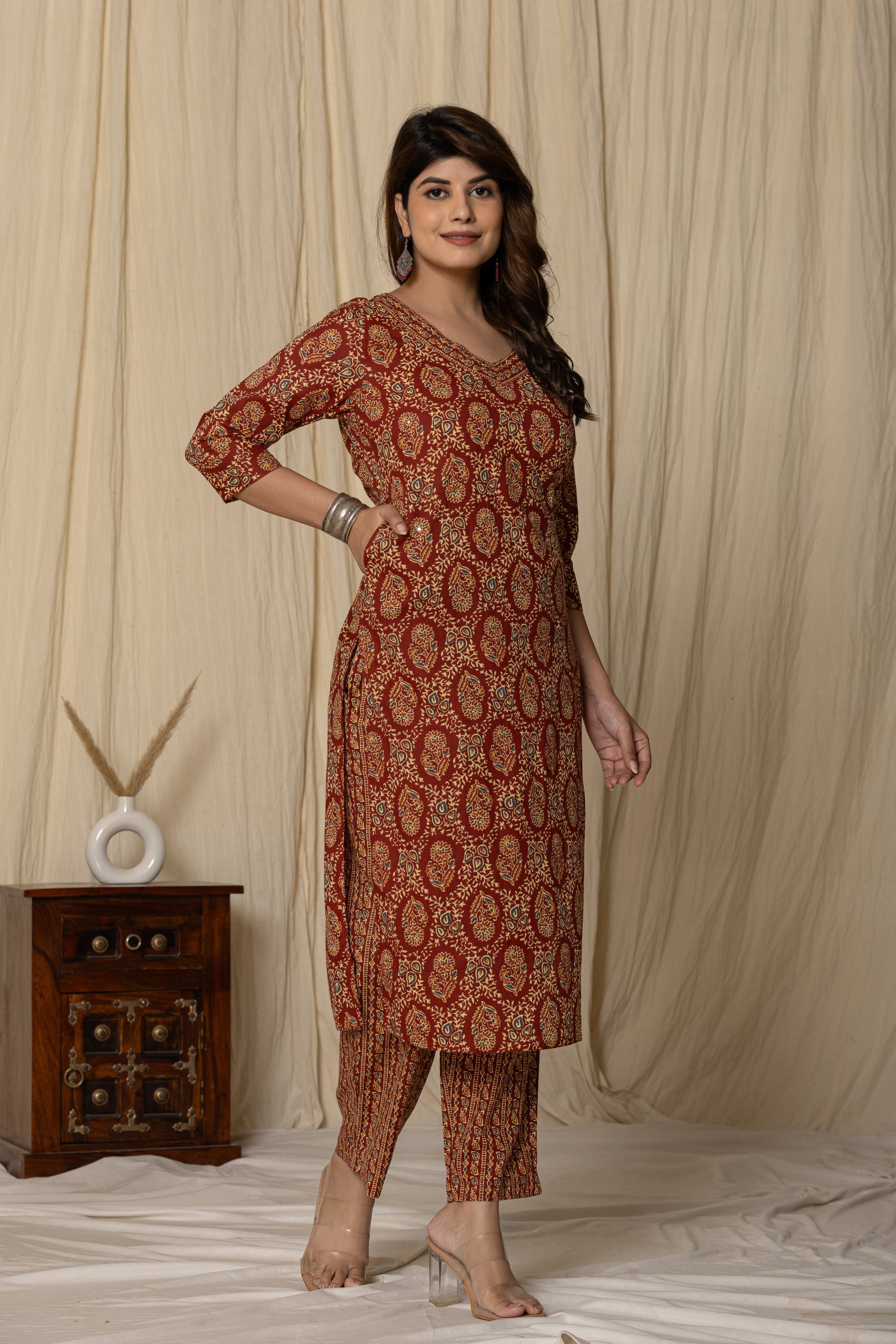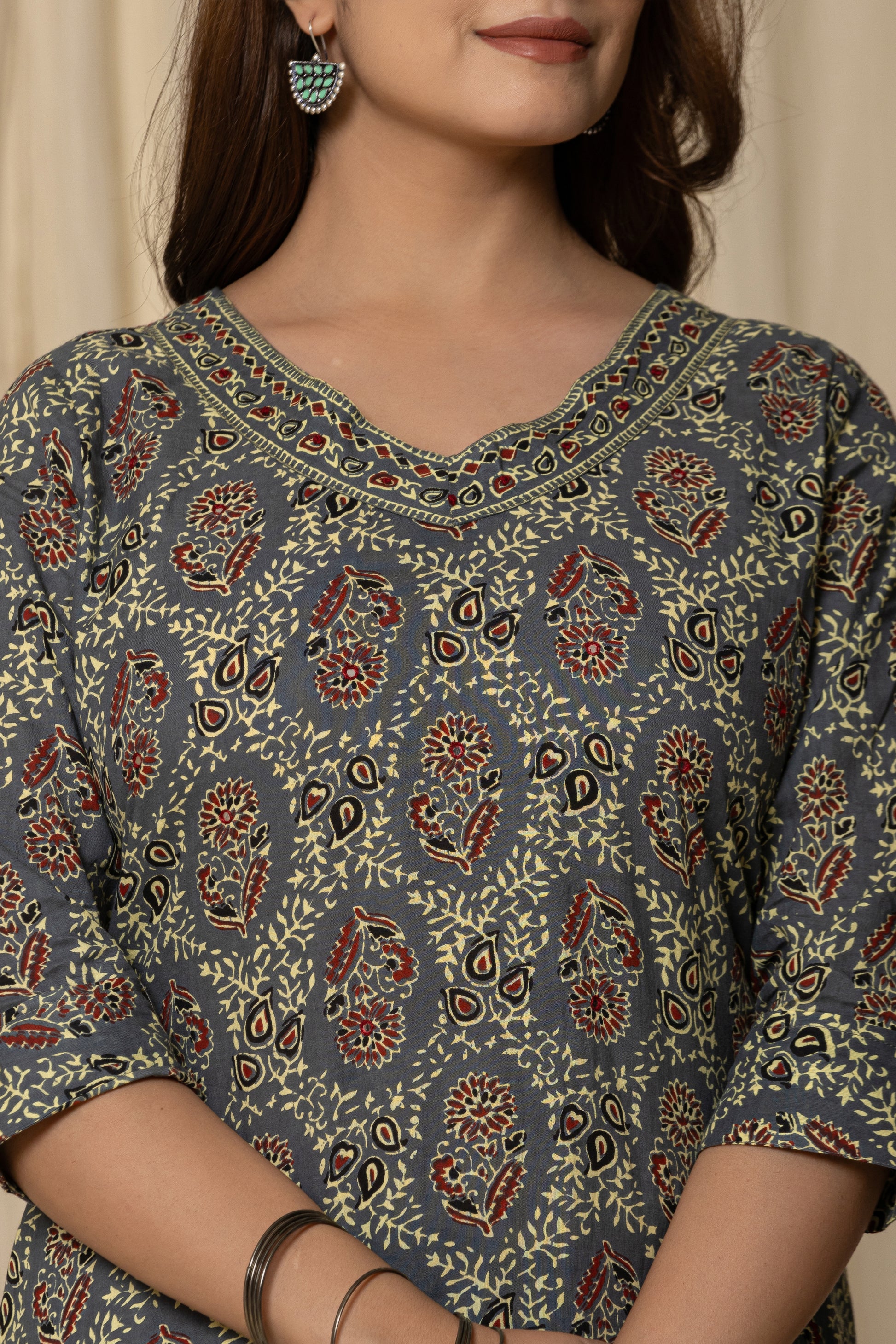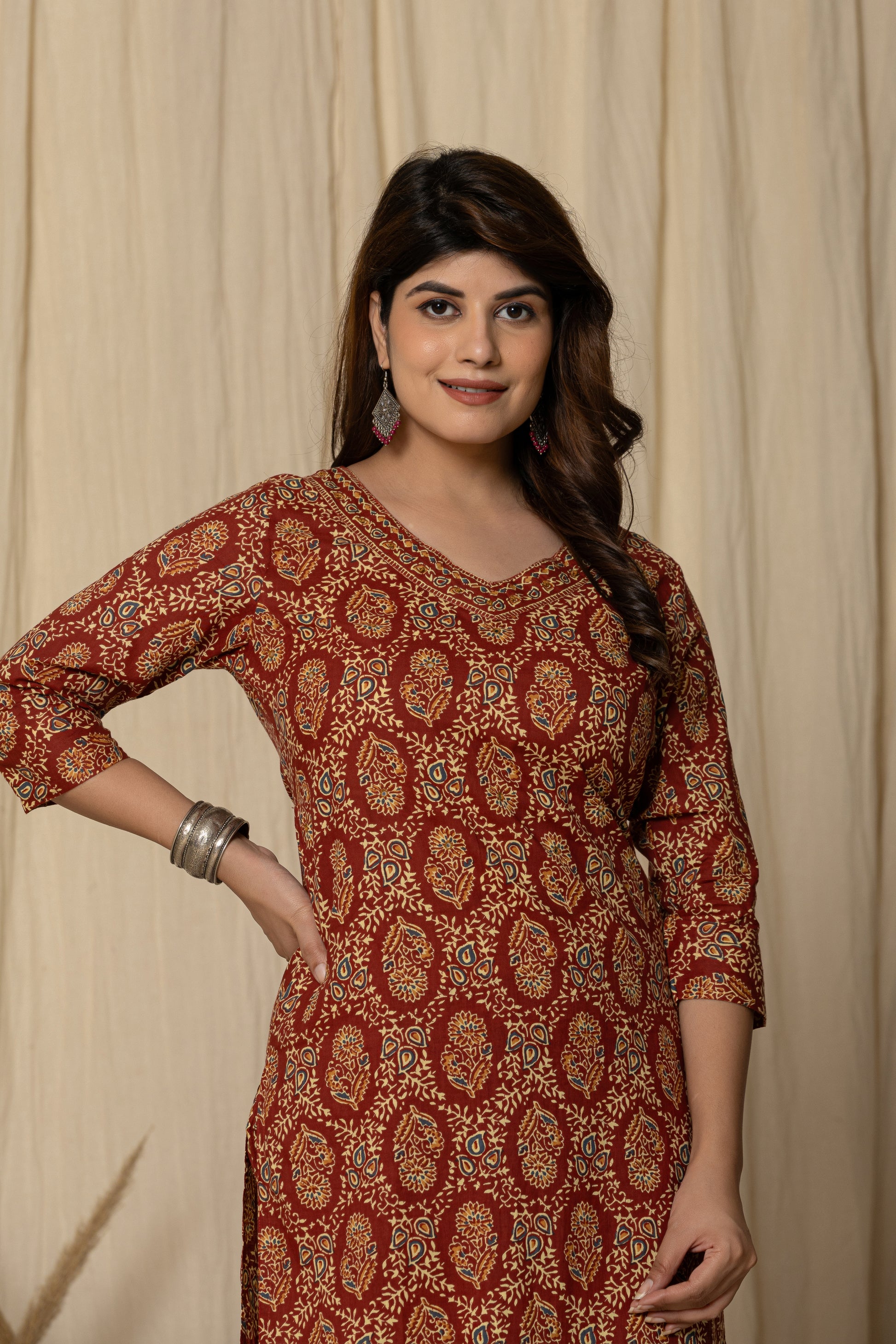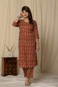 Elevate your ethnic wardrobe with this elegant Printed Cotton Kurta Set. Crafted from breathable cotton, this three-quarter sleeve kurta features a rich traditional motif, paired with matching straight-fit pants for a graceful silhouette. Perfect for casual outings or festive gatherings, this kurta set blends comfort with timeless charm.