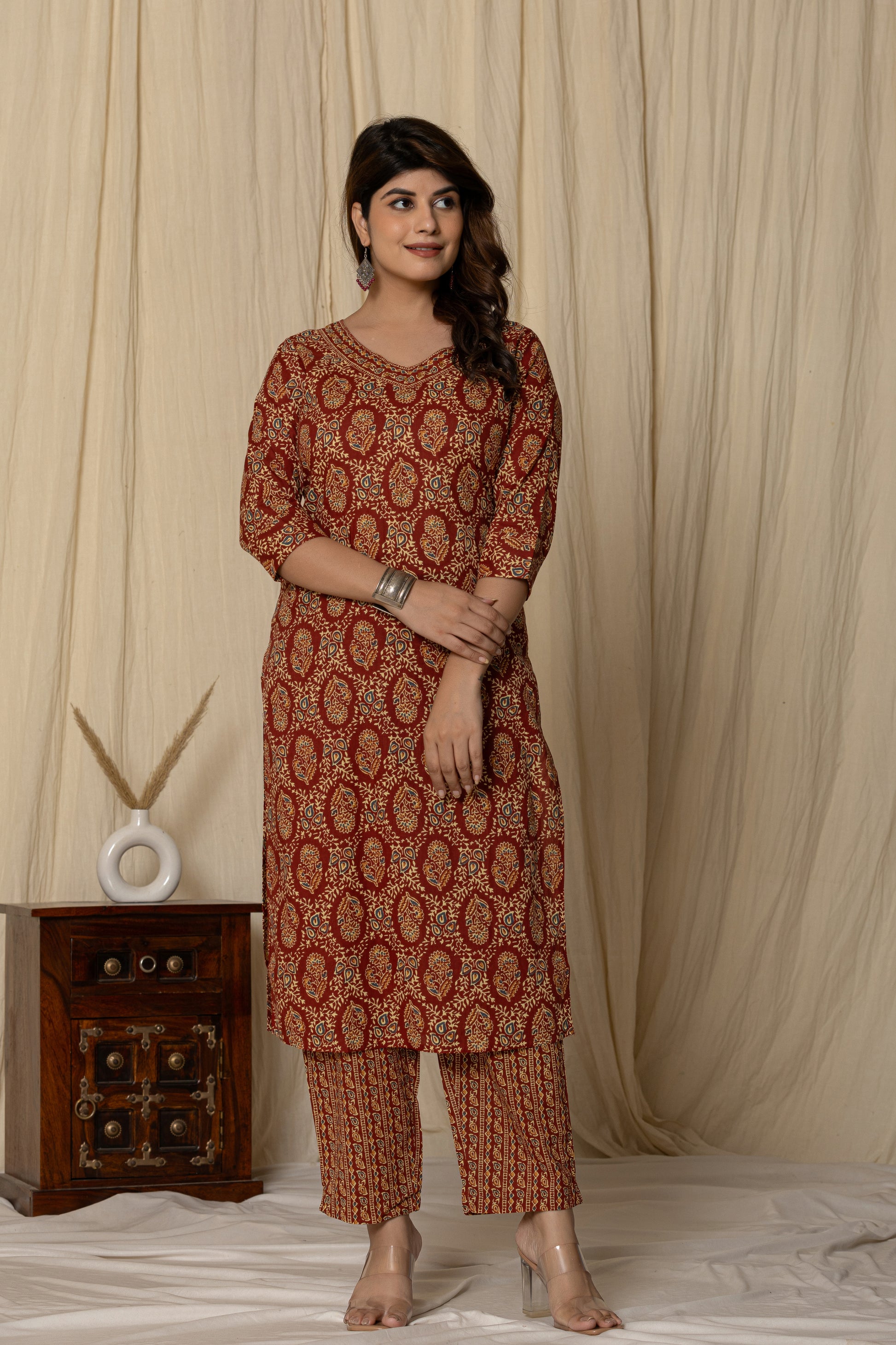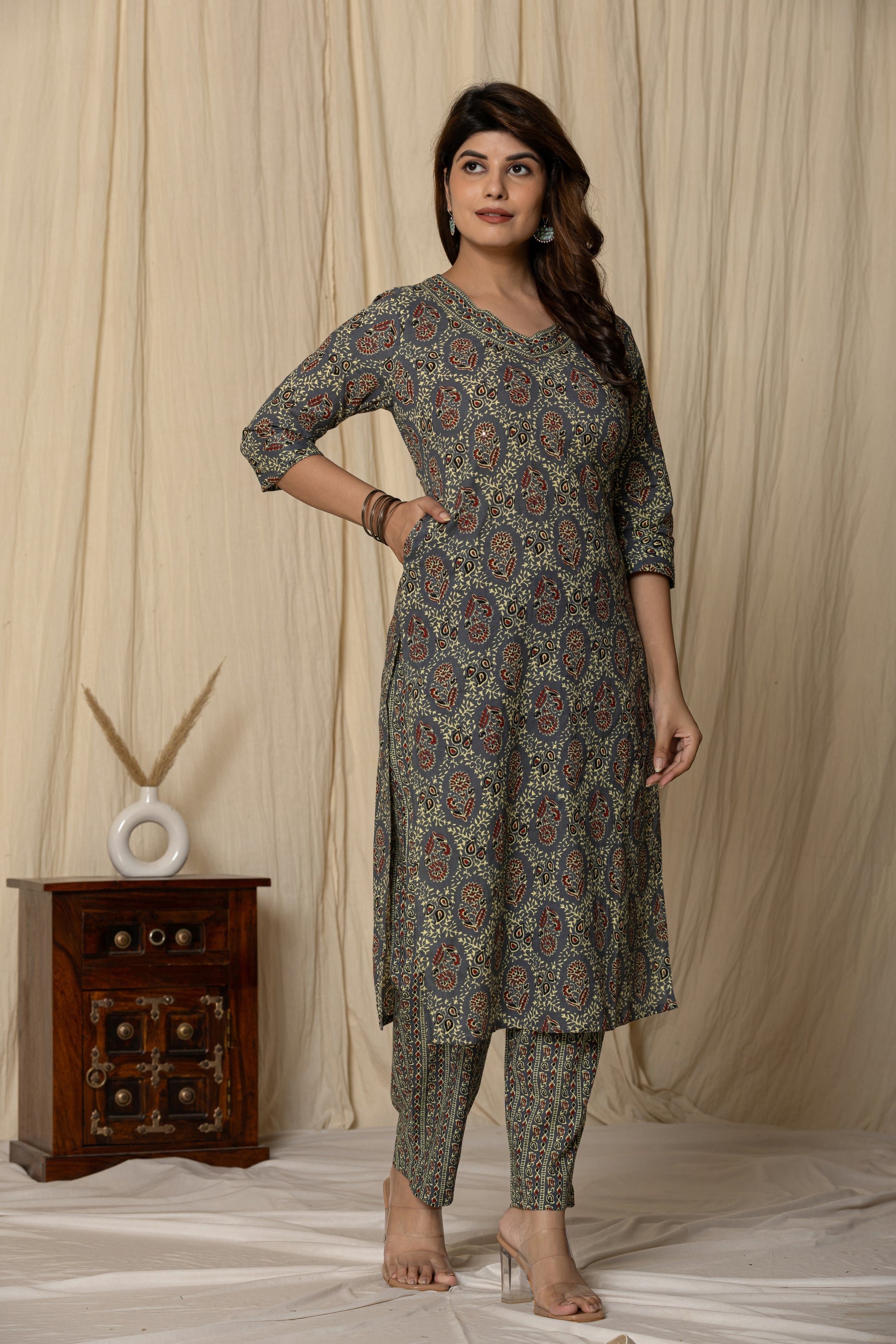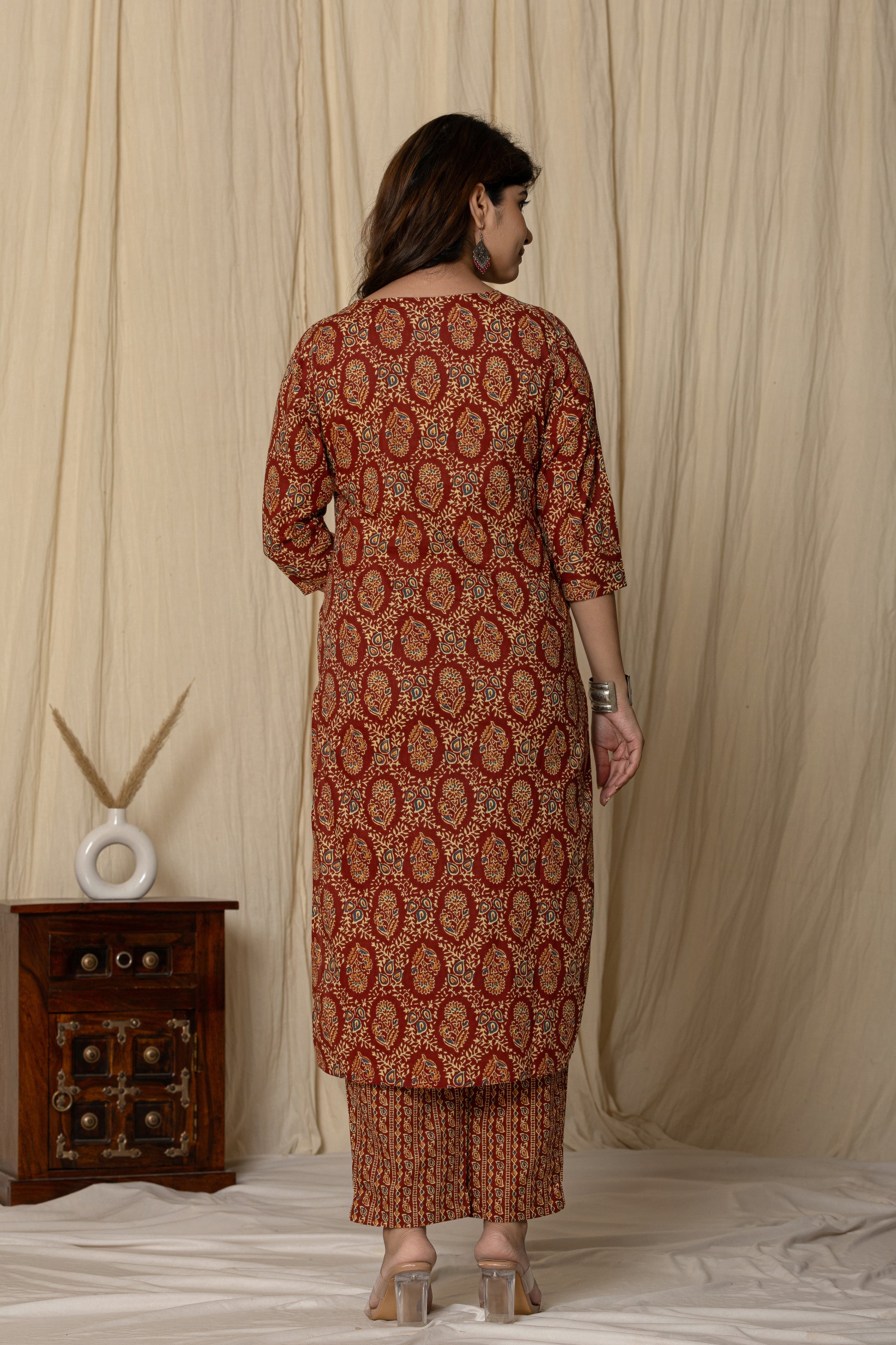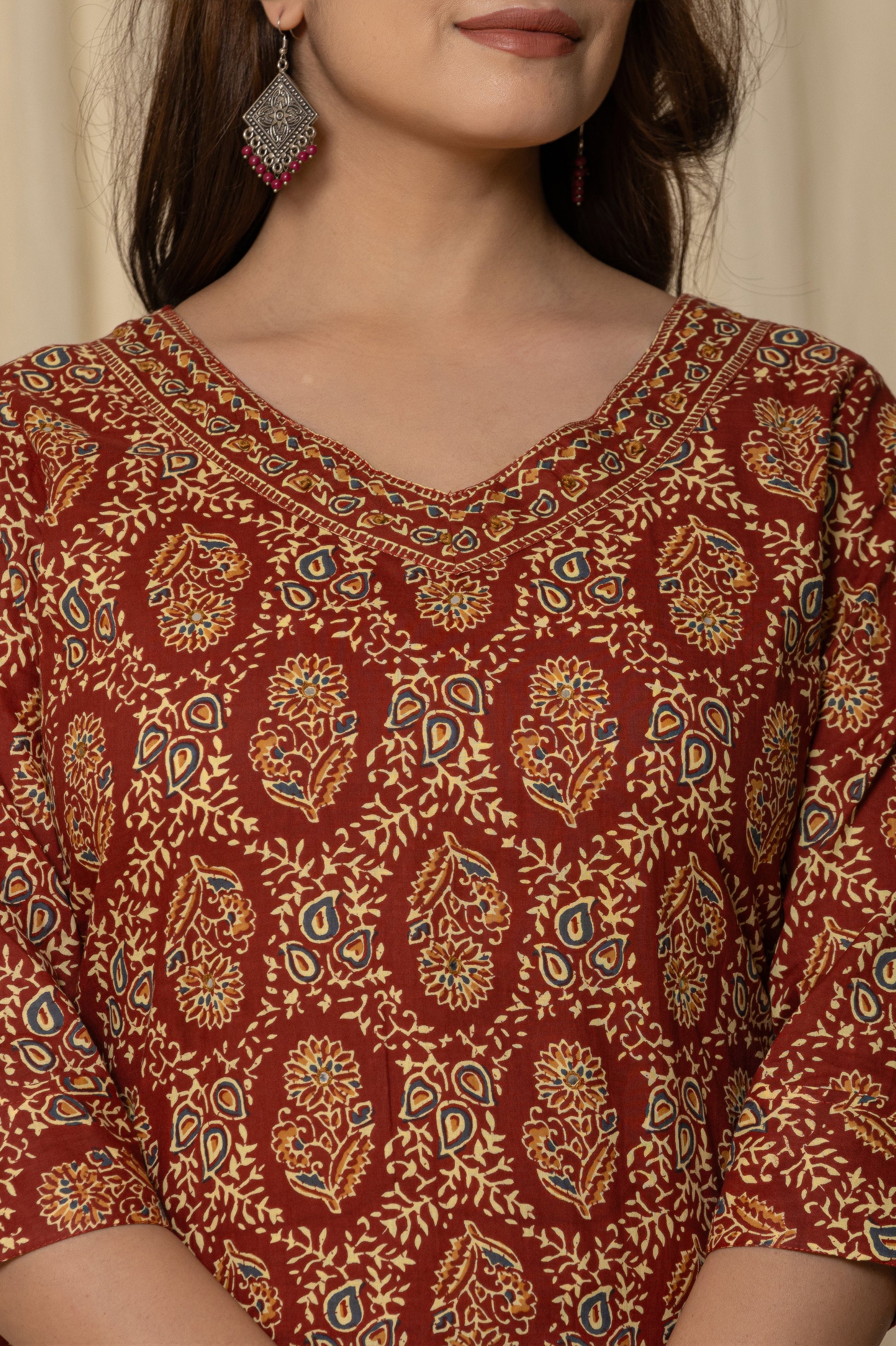 Elevate your ethnic wardrobe with this elegant Printed Cotton Kurta Set. Crafted from breathable cotton, this three-quarter sleeve kurta features a rich traditional motif, paired with matching straight-fit pants for a graceful silhouette. Perfect for casual outings or festive gatherings, this kurta set blends comfort with timeless charm.