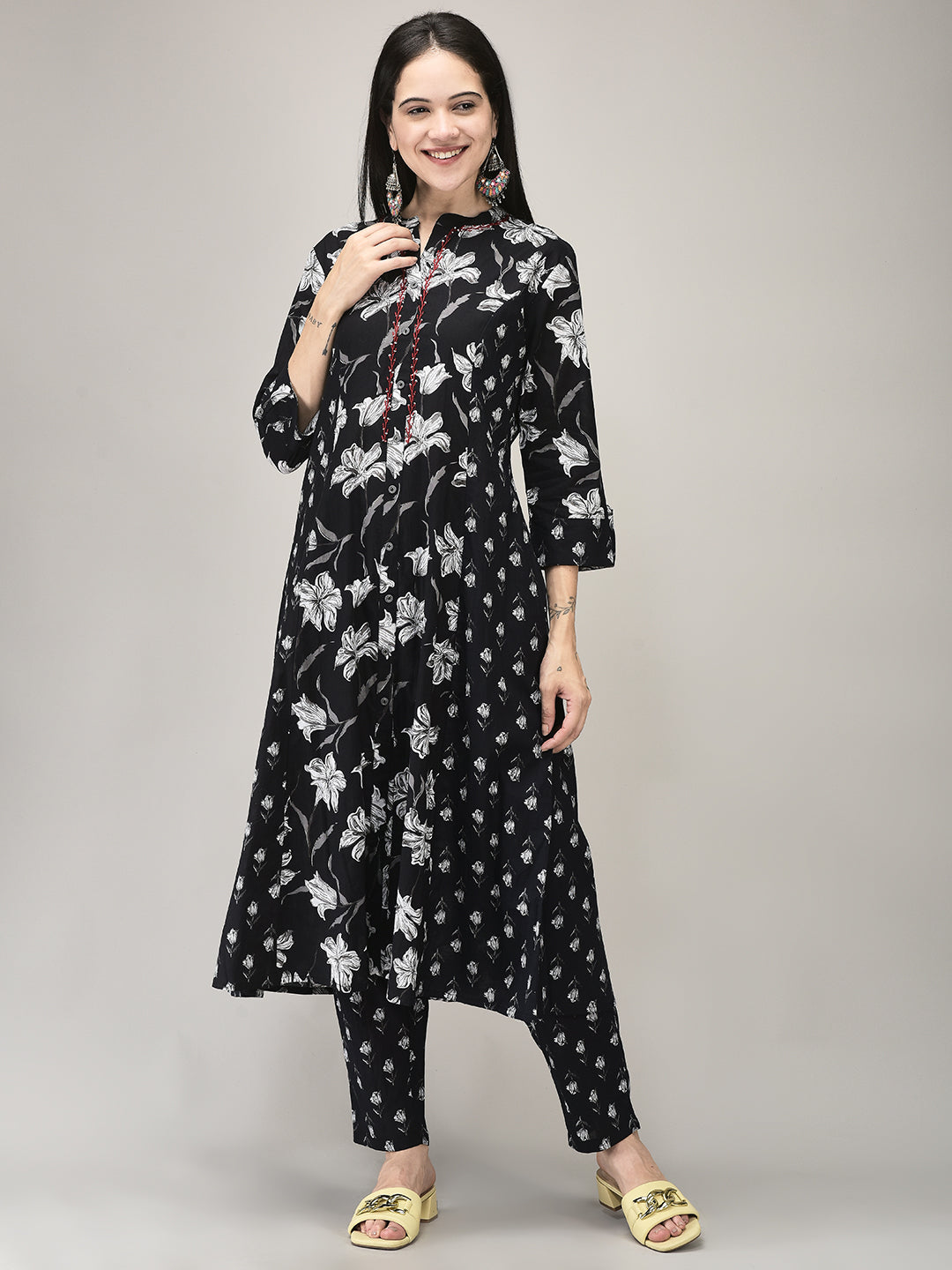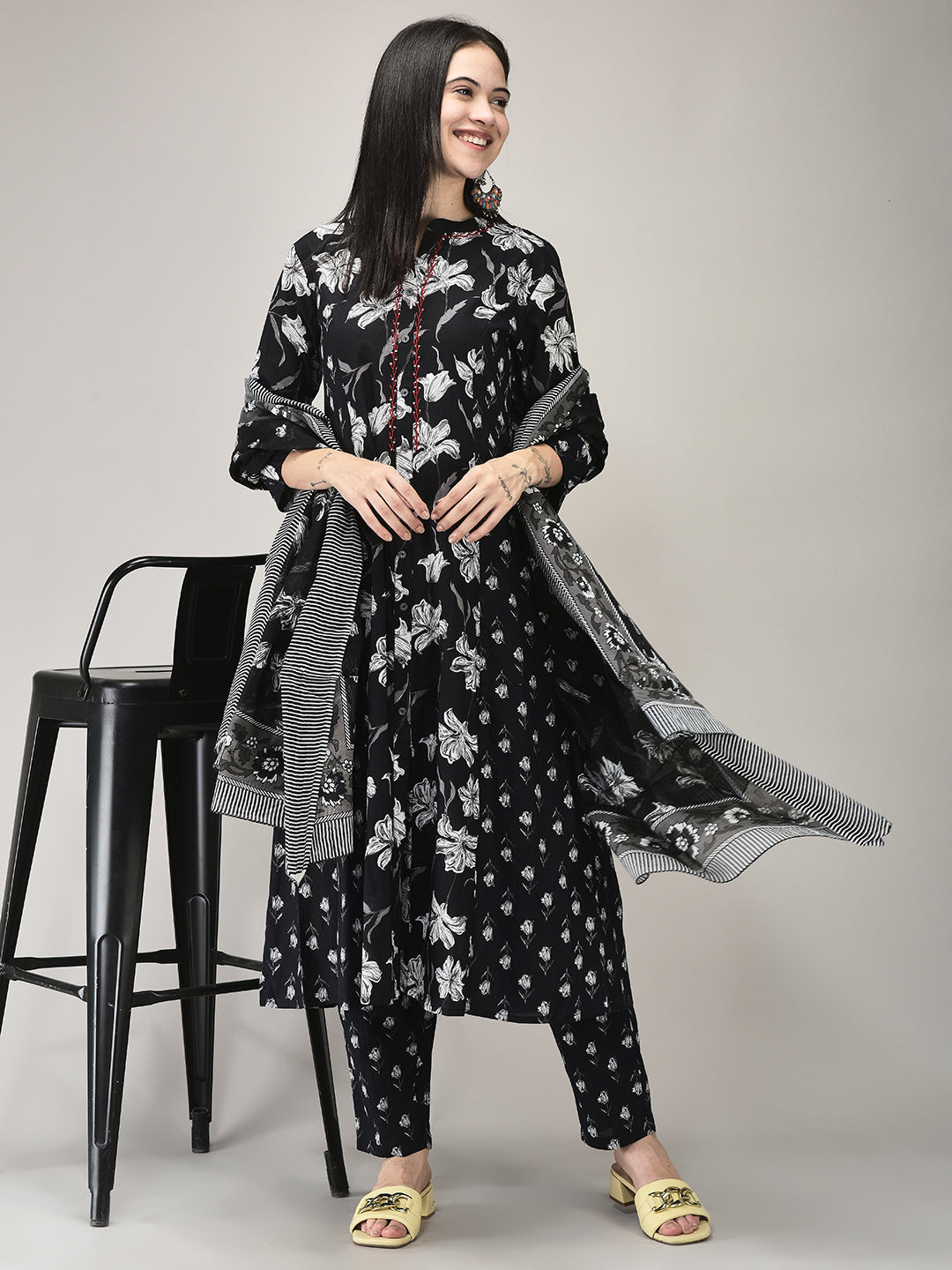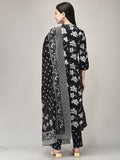 Elevate your ethnic wardrobe with this Cotton Printed Suit Set, crafted from soft, breathable cotton. The graceful A-line kurta features an elegant all-over print and flattering silhouette, paired with matching pants and a coordinating printed dupatta for a unified look. Ideal for casual outings, festive gatherings, or enriched daywear, the classic black shade and comfortable fit deliver both elegance and ease. A versatile ensemble that beautifully marries traditional charm with contemporary sophistication—perfect for women’s ethnic wear.