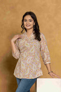 Add a touch of charm to your everyday wardrobe with this women’s cotton pink short printed kurta, crafted in a straight fit silhouette. Made from soft, breathable cotton fabric, it features a stylish V-neck with a stand-up collar, 3/4th sleeves, and delicate ethnic floral prints. Perfect for casual outings, office wear, or semi-formal looks, this ethnic short kurta pairs beautifully with jeans, jeggings, or trousers.