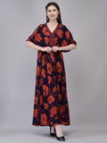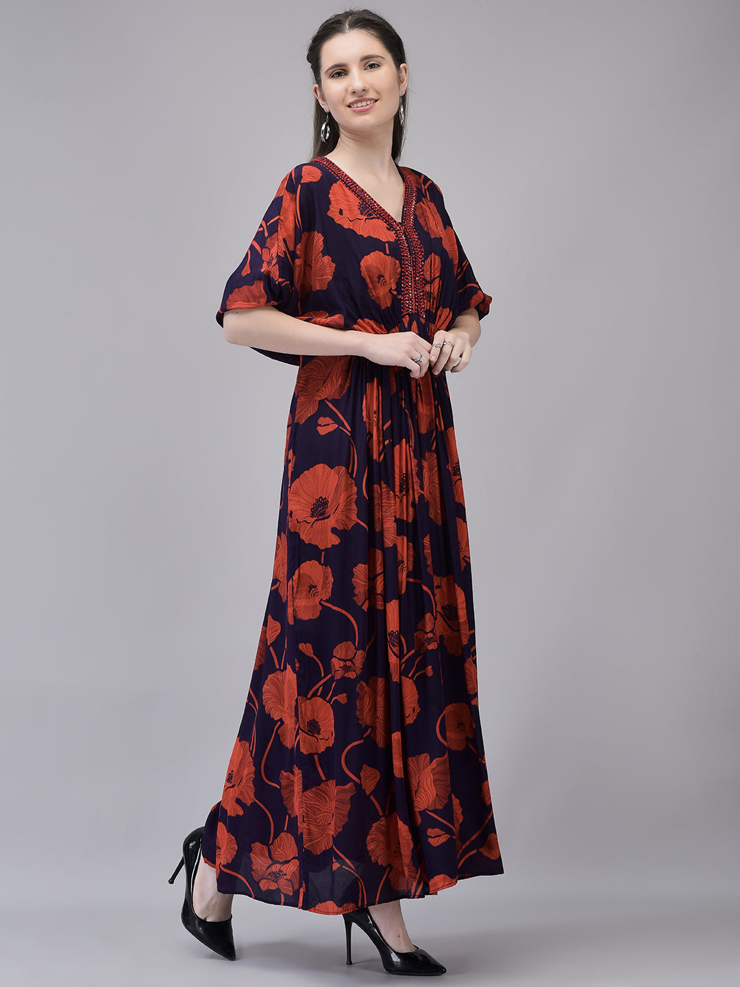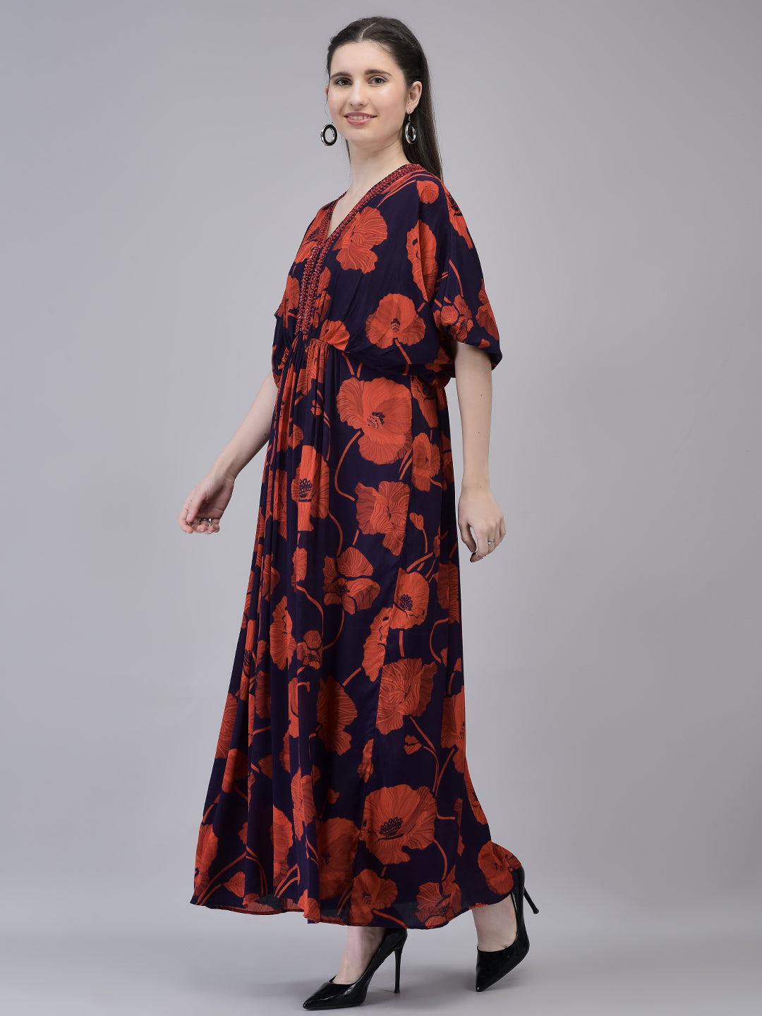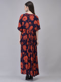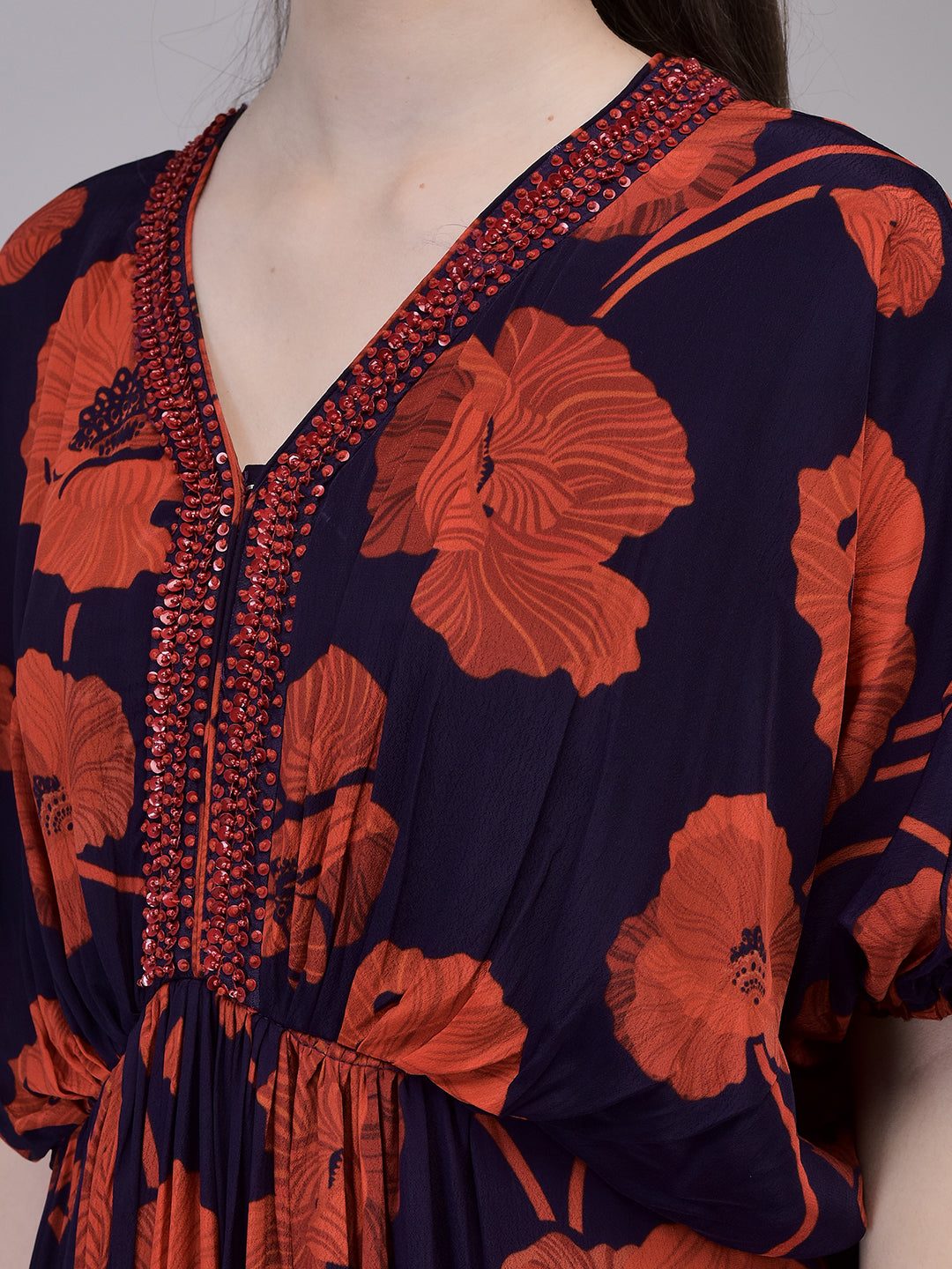 Turn heads with Aralia’s Crepe Red Printed Maxi Dress. Featuring bold floral prints, a V-neckline with bead embroidery, and airy flared sleeves, this printed crepe maxi dress is perfect for festive occasions, evening outings, or holiday looks.