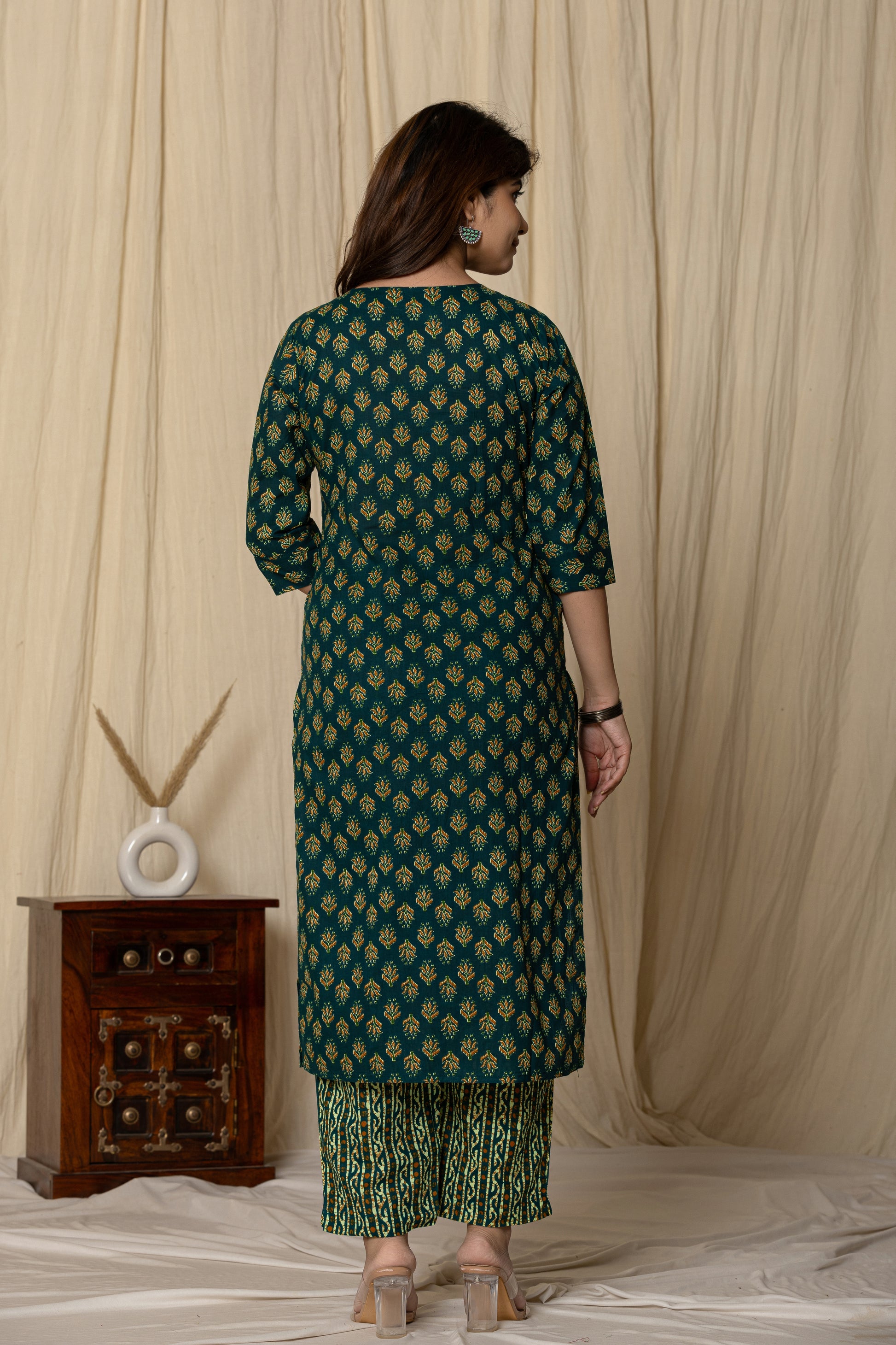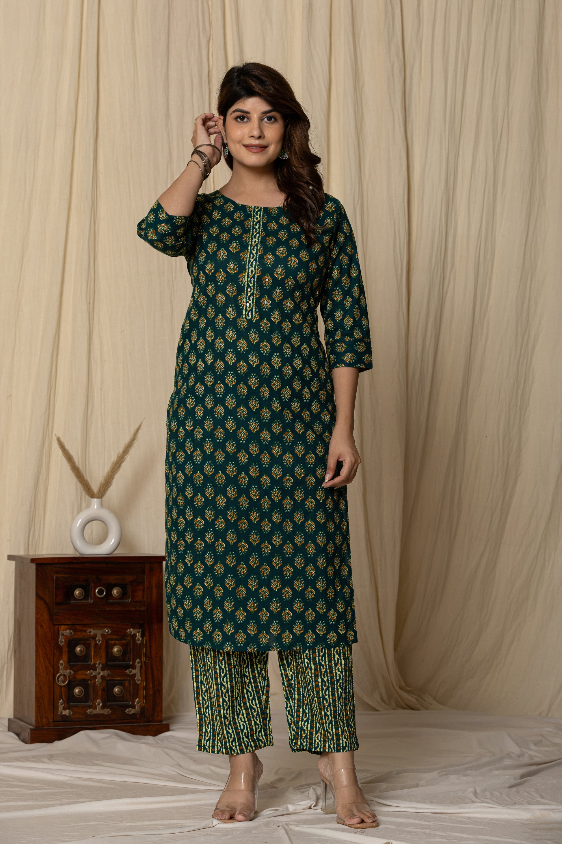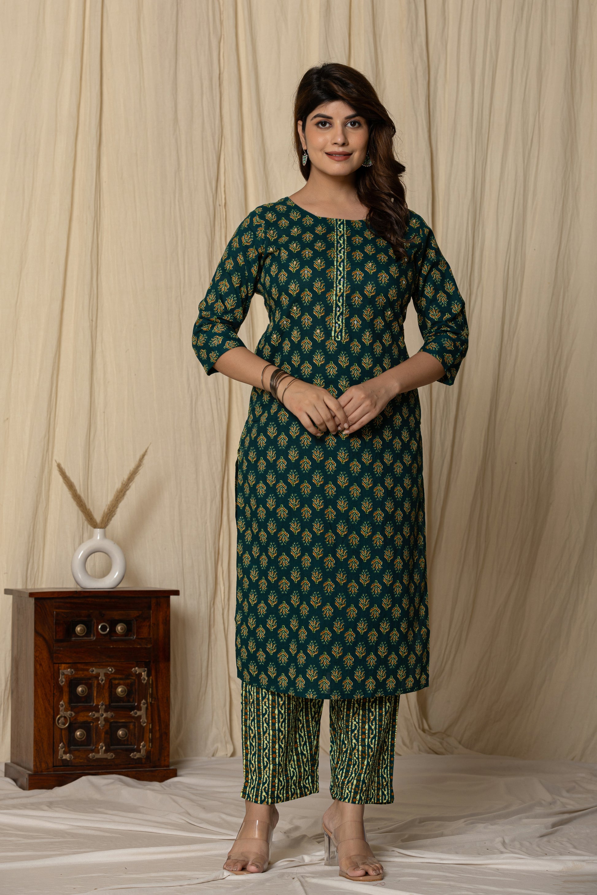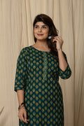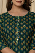 Add a touch of tradition to your wardrobe with this elegant dark green printed kurta set. Designed with all-over golden floral motifs, this straight-cut kurta features a stylish front placket and comfortable 3/4 sleeves. The coordinated printed pants complement the look perfectly, making it ideal for casual outings, festive gatherings, or office wear. Crafted from soft, breathable fabric for all-day comfort.