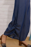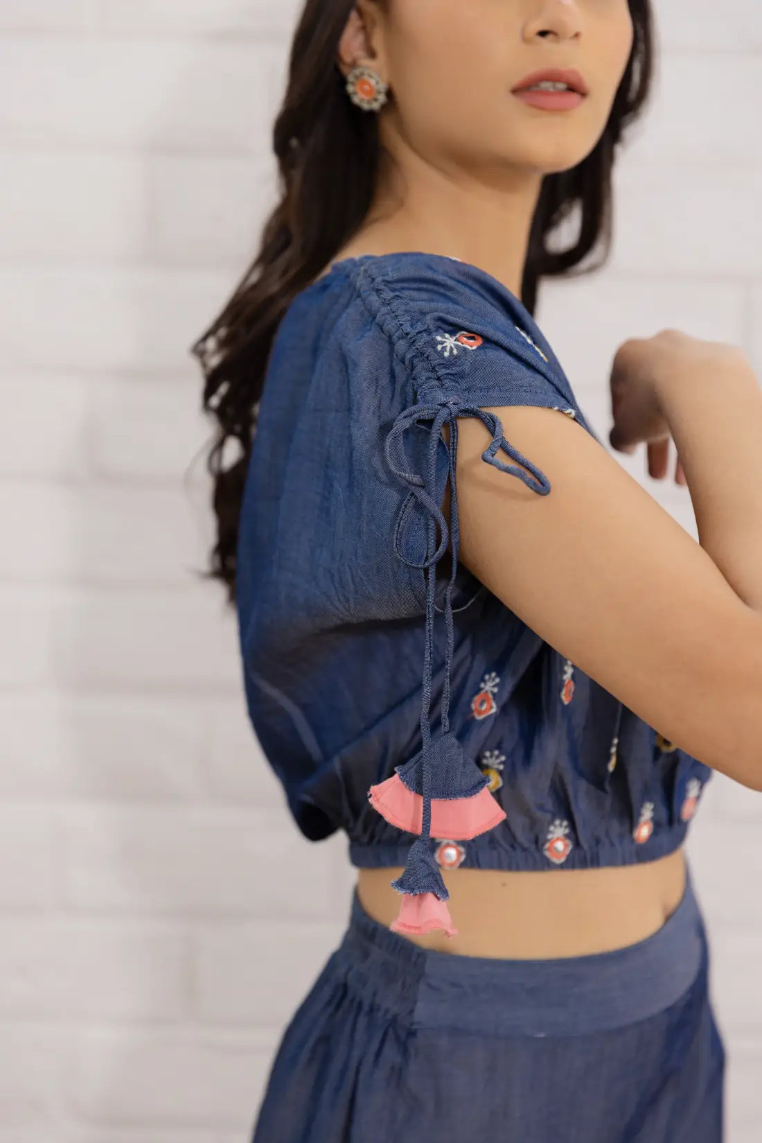 Make a statement with this denim blue co-ord set that effortlessly blends comfort and style. Crafted from soft, breathable fabric, this stylish set features a drawstring crop top adorned with vibrant embroidered accents and playful tassels on the sleeves. The coordinated palazzo pants offer a relaxed fit with ruffle detailing at the hem, adding a touch of flair to your everyday or weekend wardrobe.