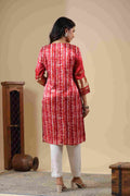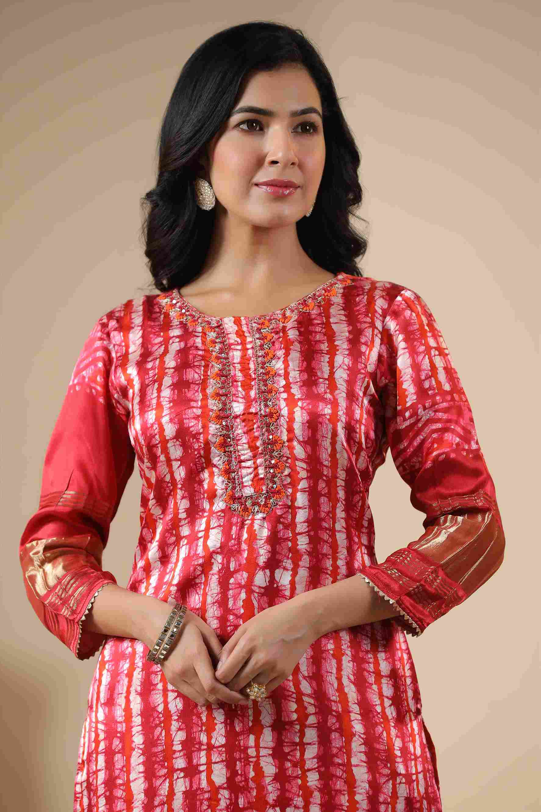 Elevate your ethnic wardrobe with this women’s Gaji silk red printed kurta, designed in a graceful straight-cut silhouette. Crafted from premium Gaji silk fabric, this kurta features a classic round neckline, 3/4th sleeves, and a vibrant tie-dye print enhanced with zari work. Perfect for festive occasions and traditional outings, this fully stitched kurta pairs beautifully with trousers or leggings.