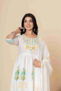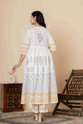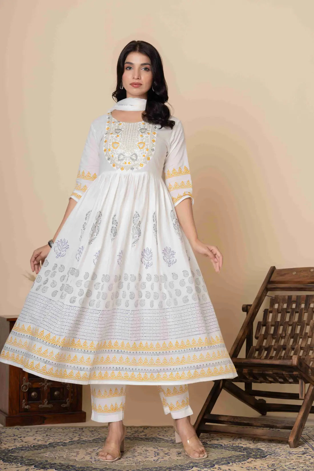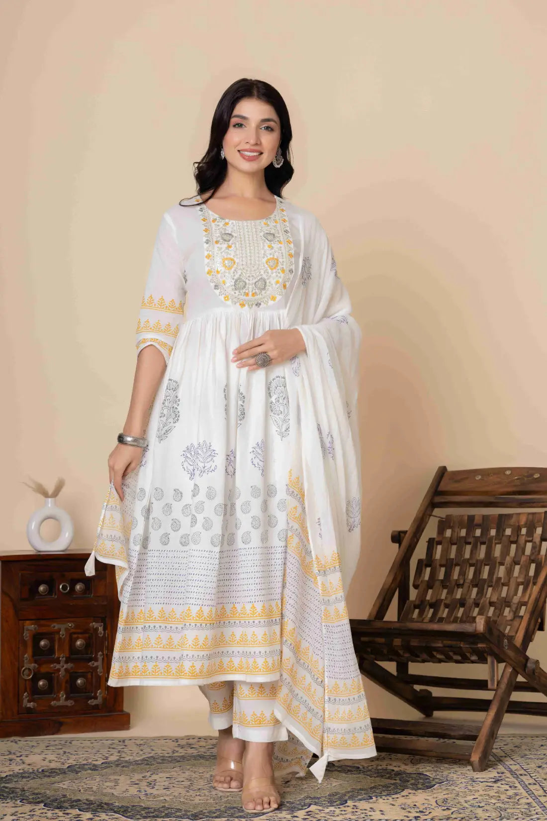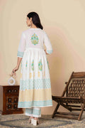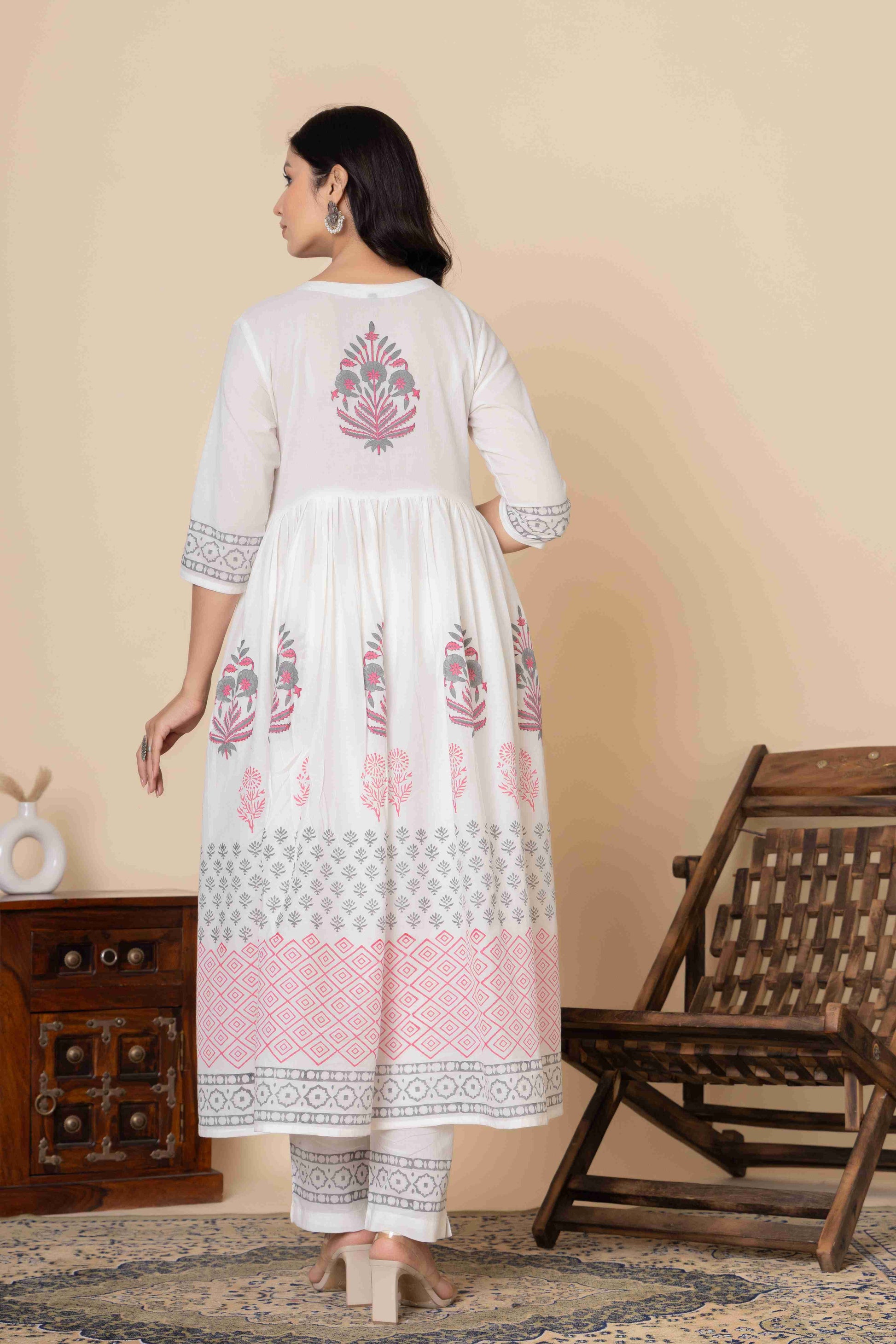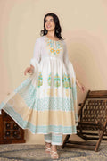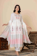 This exquisite Cotton Anarkali Suit Set will elevate your ethnic wardrobe. It comes in three lovely color combinations and is made to showcase classic Indian style with contemporary comfort. This three-piece outfit consists of a soft, flowing dupatta, matched slacks, and an artistically printed Anarkali kurta made of high-quality material. The ethnic print adds timeless cultural charm, and the elegant Anarkali silhouette provides a flattering fit.