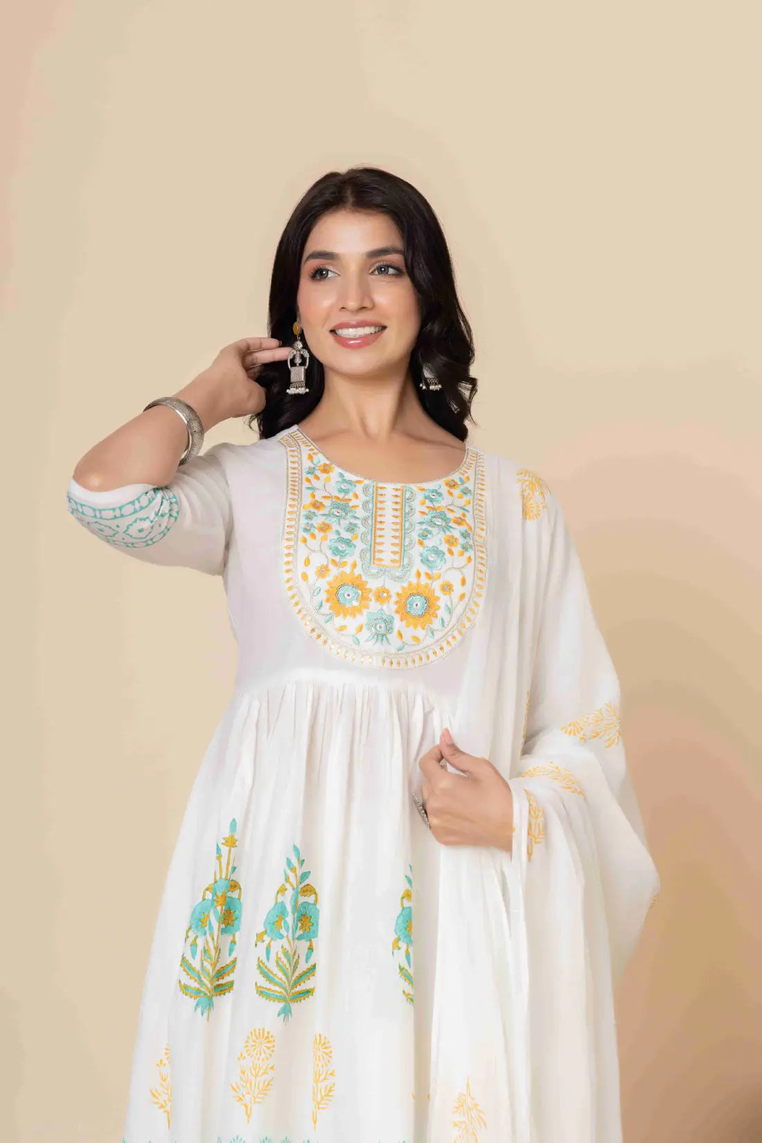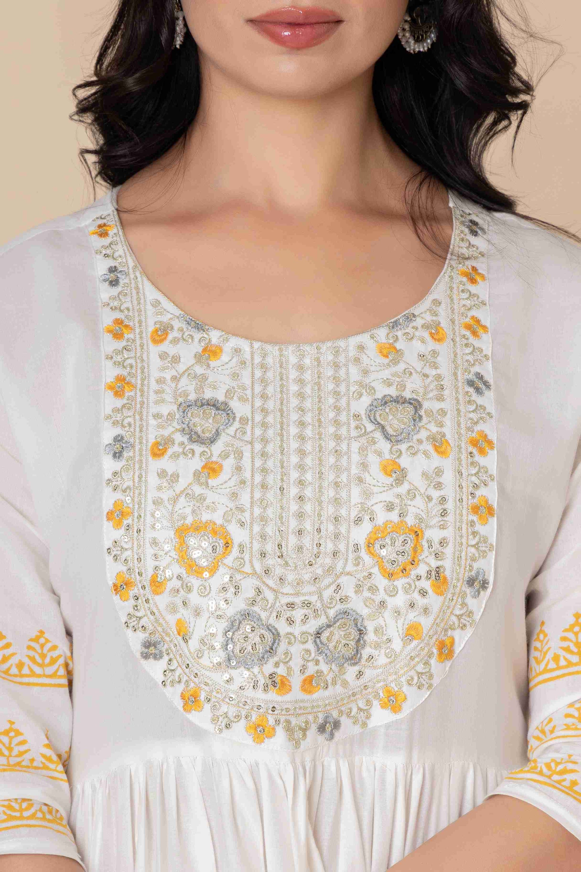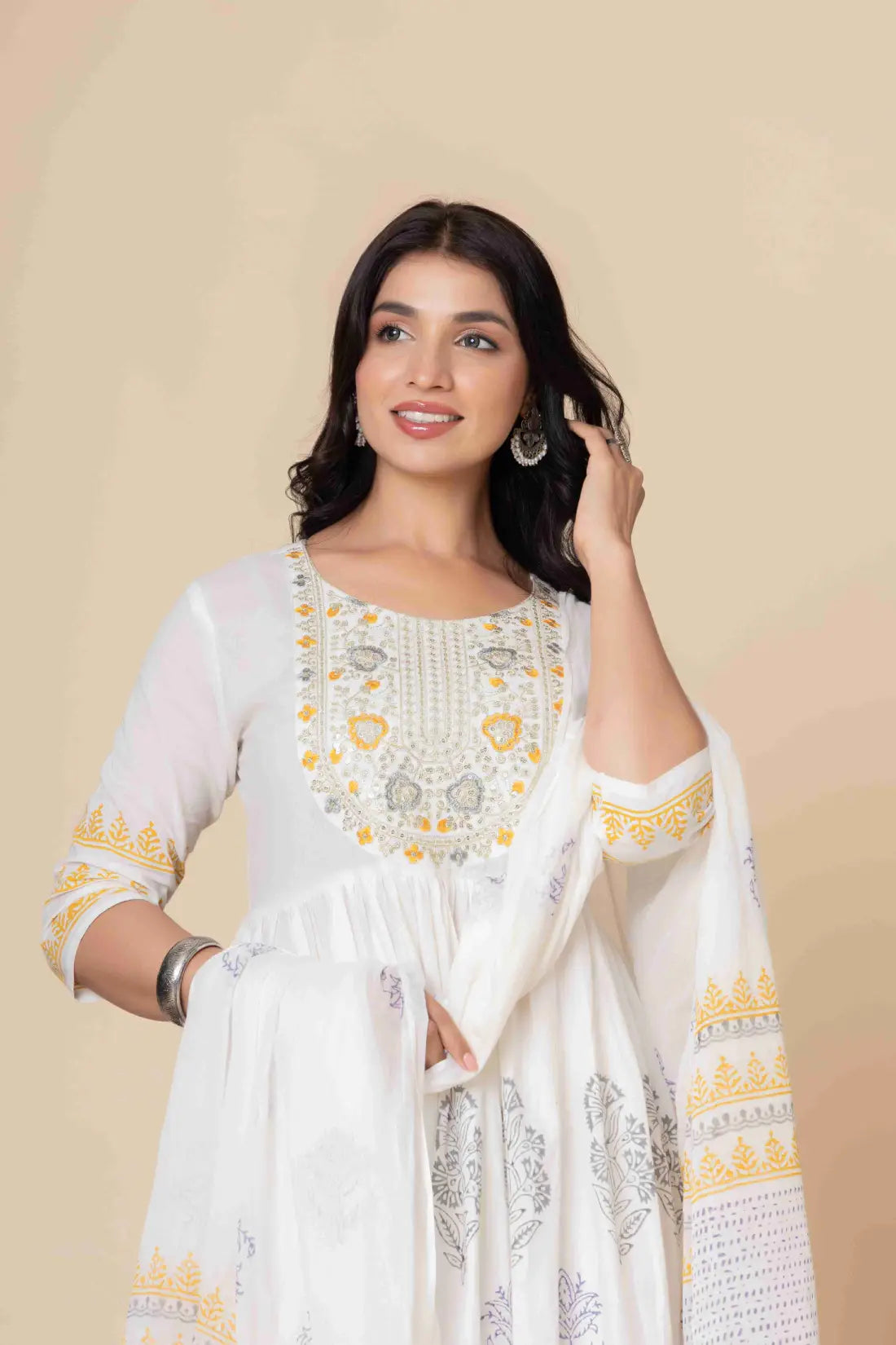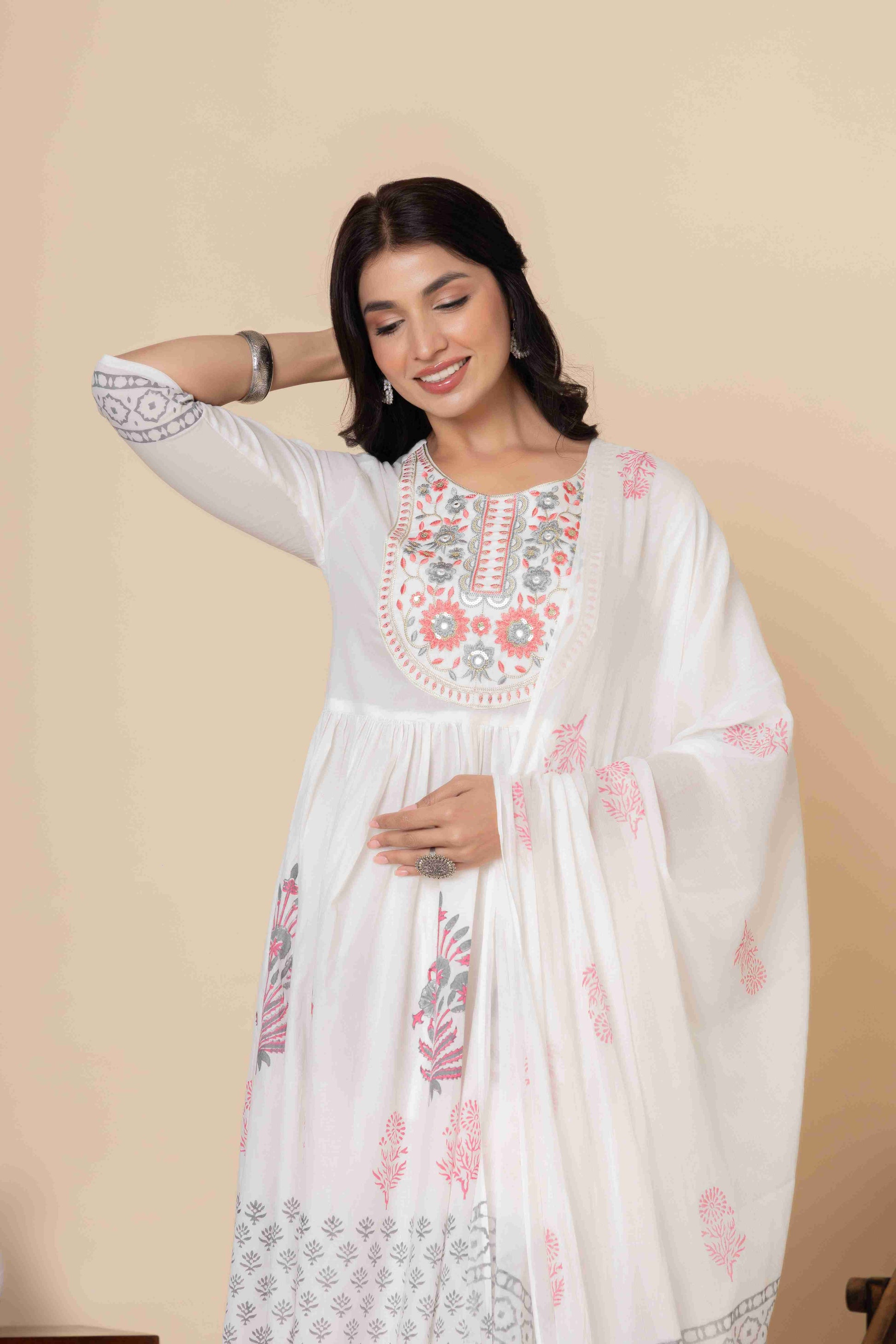 This exquisite Cotton Anarkali Suit Set will elevate your ethnic wardrobe. It comes in three lovely color combinations and is made to showcase classic Indian style with contemporary comfort. This three-piece outfit consists of a soft, flowing dupatta, matched slacks, and an artistically printed Anarkali kurta made of high-quality material. The ethnic print adds timeless cultural charm, and the elegant Anarkali silhouette provides a flattering fit.