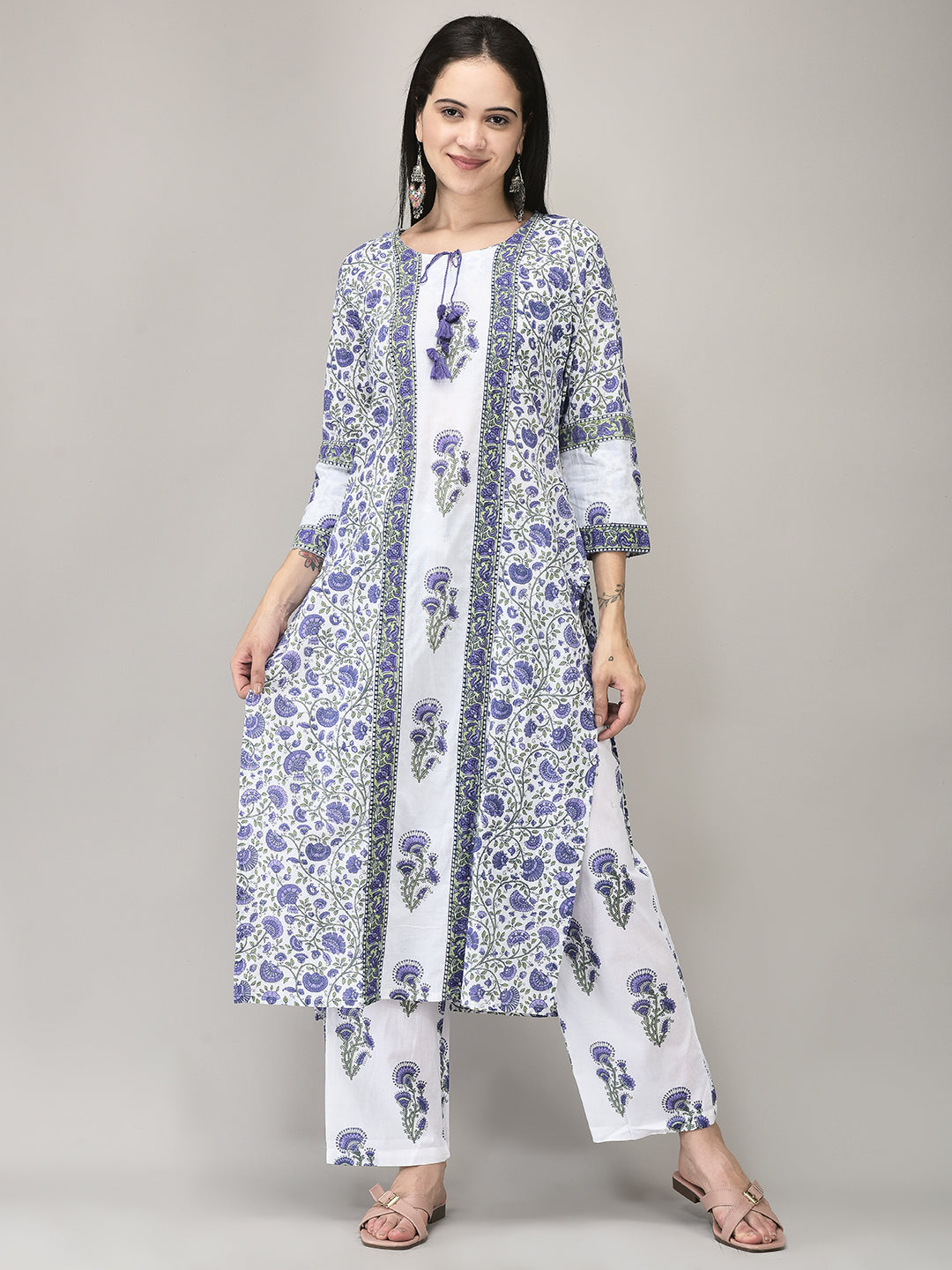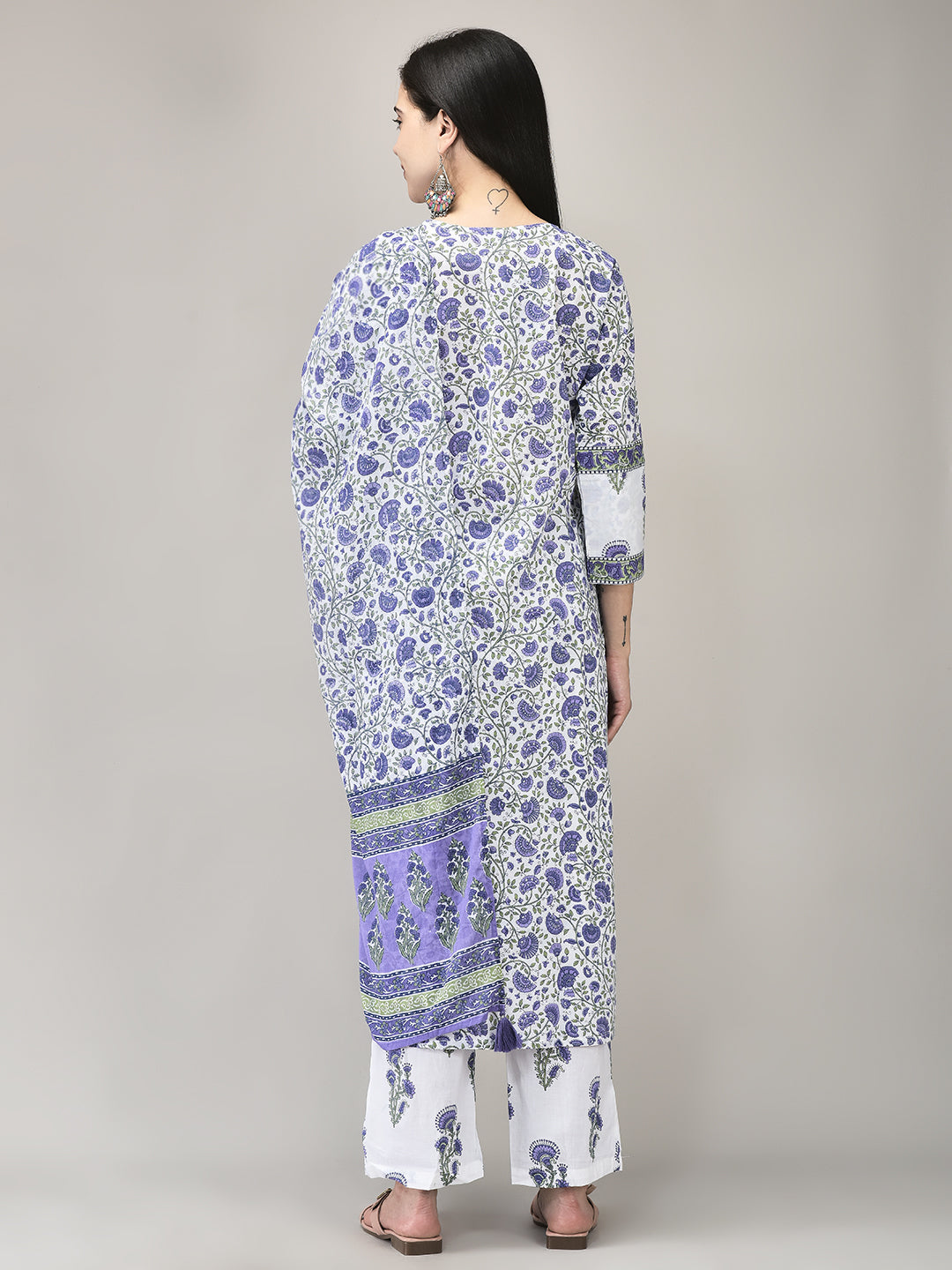 Add a touch of elegance to your ethnic wardrobe with this Lavender Cotton Suit Set, crafted from soft, breathable cotton. The straight-cut kurta features delicate floral prints, complemented by matching pants and a coordinating printed dupatta for a cohesive look. Ideal for casual outings, festive gatherings, or family events, the soothing lavender hue and comfortable fit offer both style and ease. A versatile ensemble that seamlessly blends traditional charm with modern flair.
