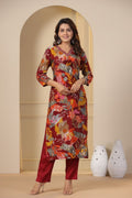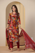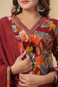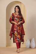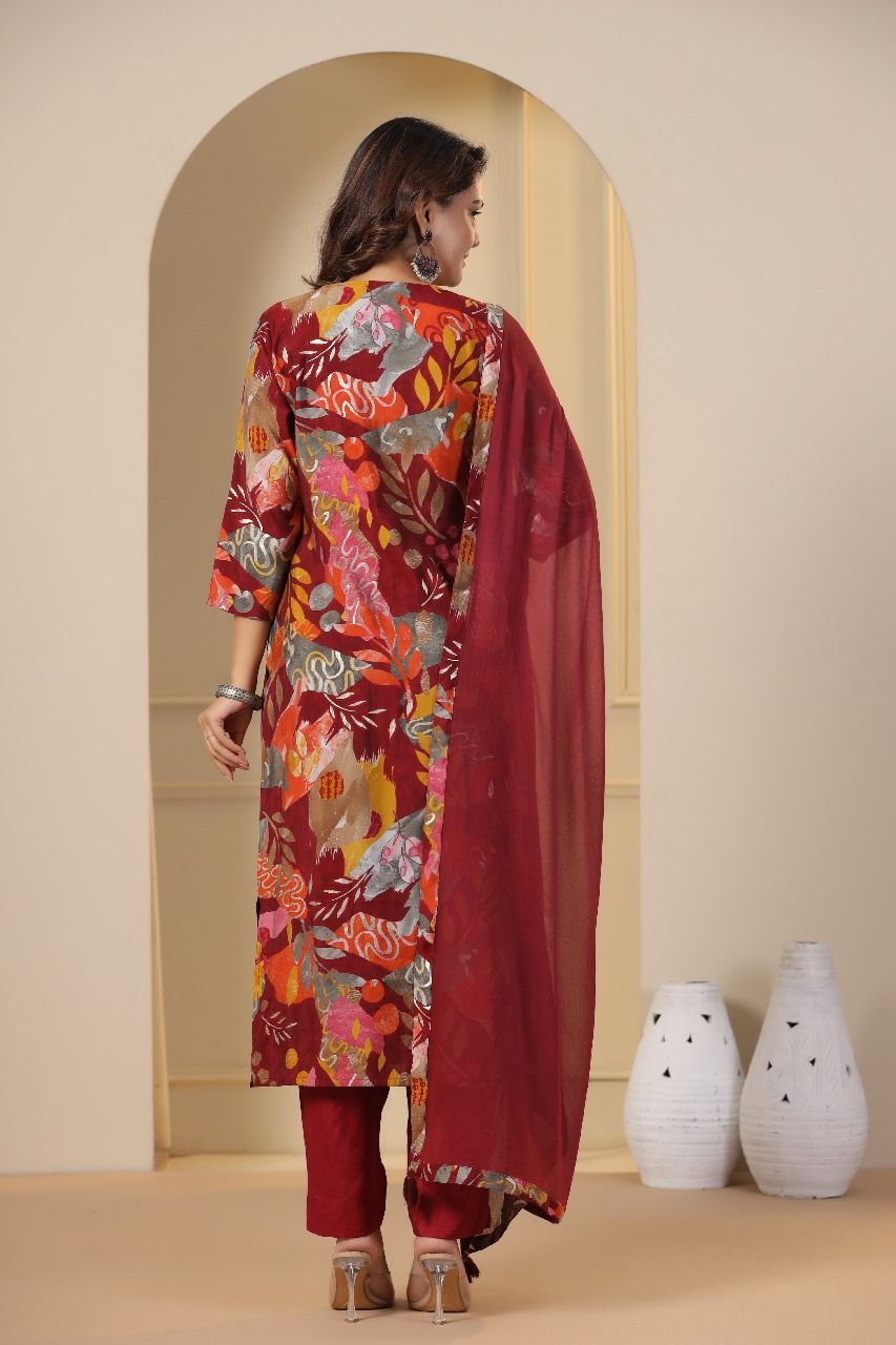 Embrace elegance with this Maroon Modal Printed Suit Set, featuring a straight-cut kurta, coordinating pants, and a matching dupatta. Crafted from soft, breathable modal fabric, it offers comfort and style for both casual and festive occasions. The intricate floral print adds a touch of sophistication, making it a versatile addition to your wardrobe. Discover refined women’s ethnic wear at Aralia—where tradition meets modern design.