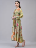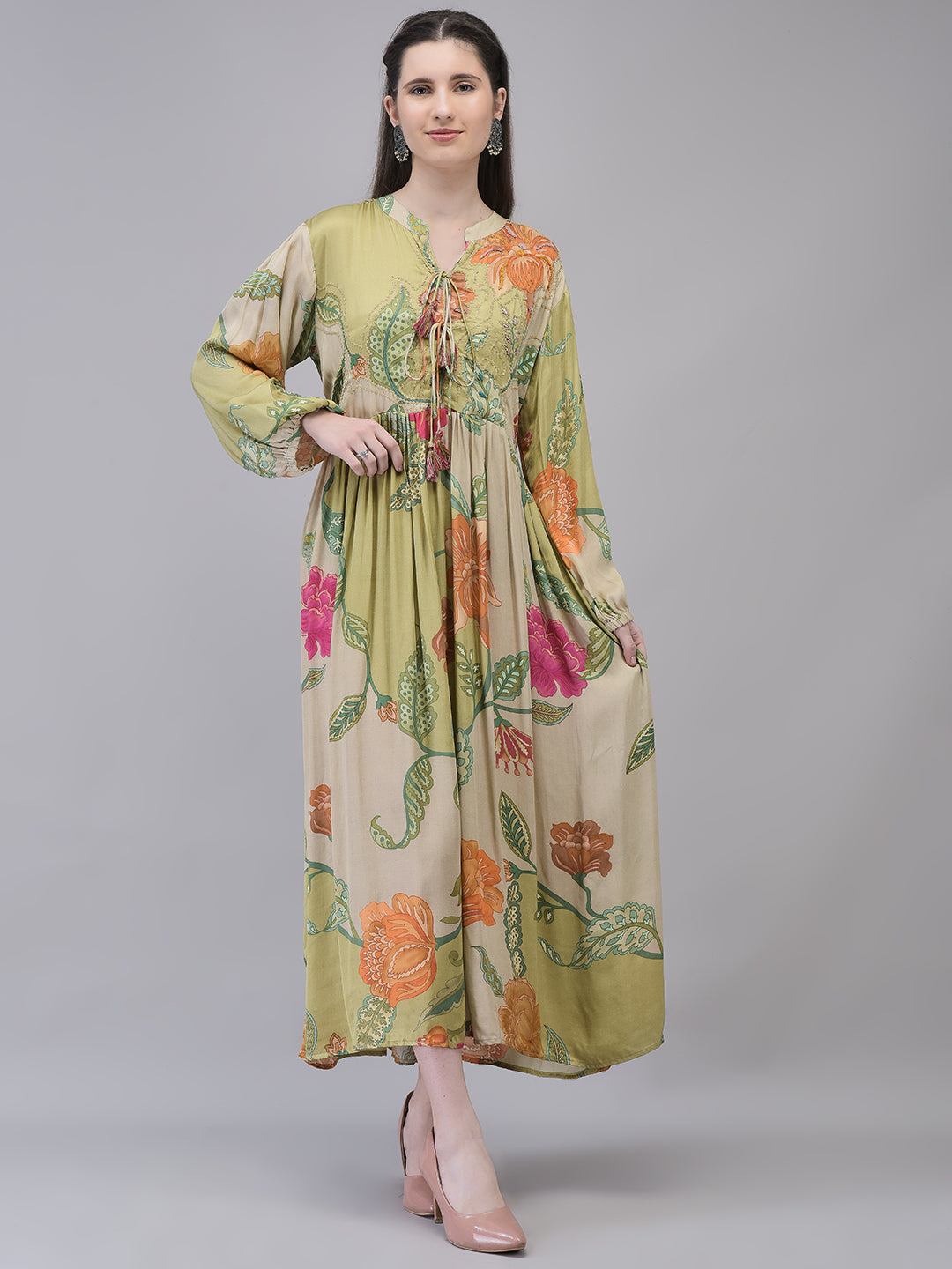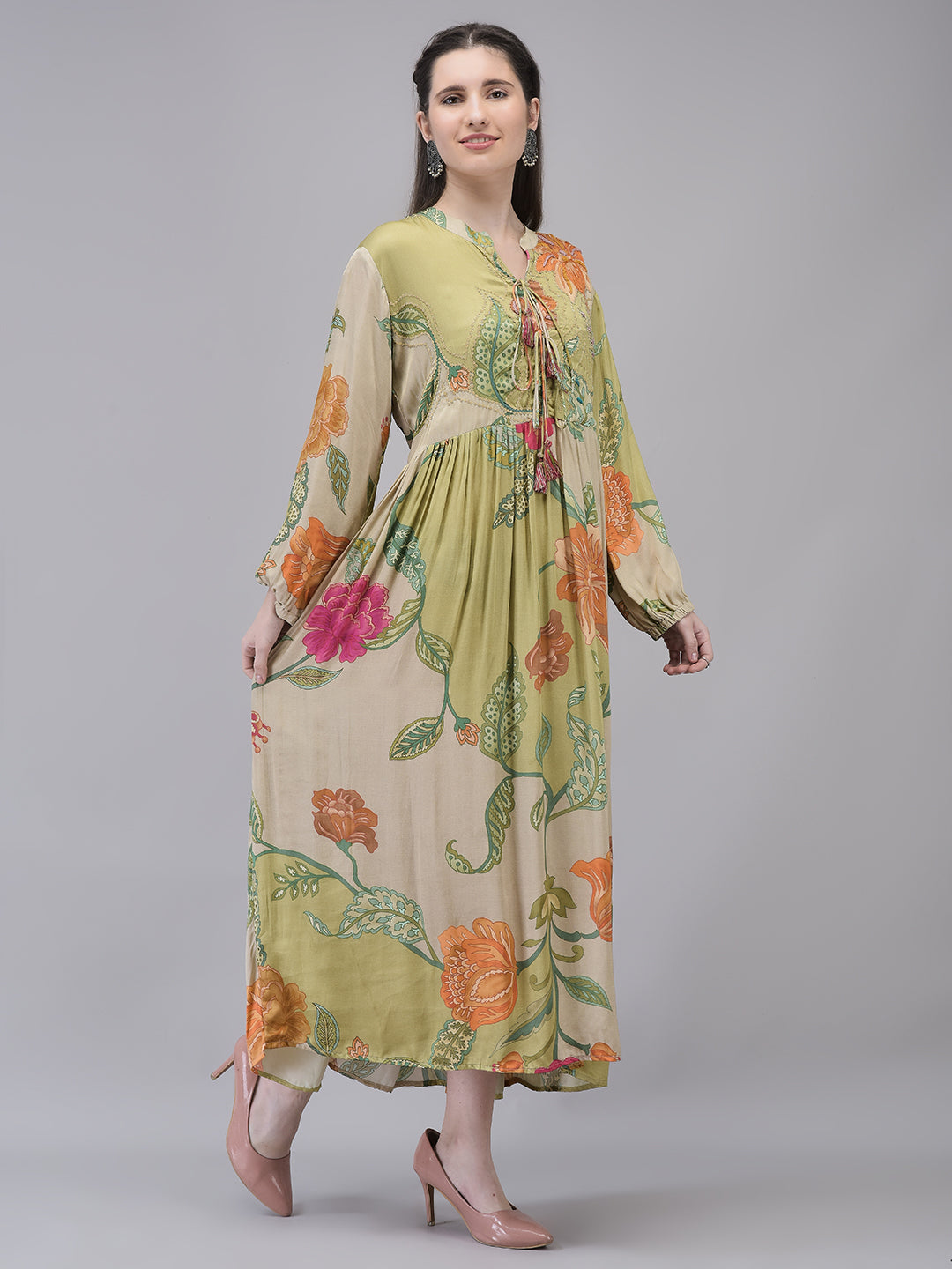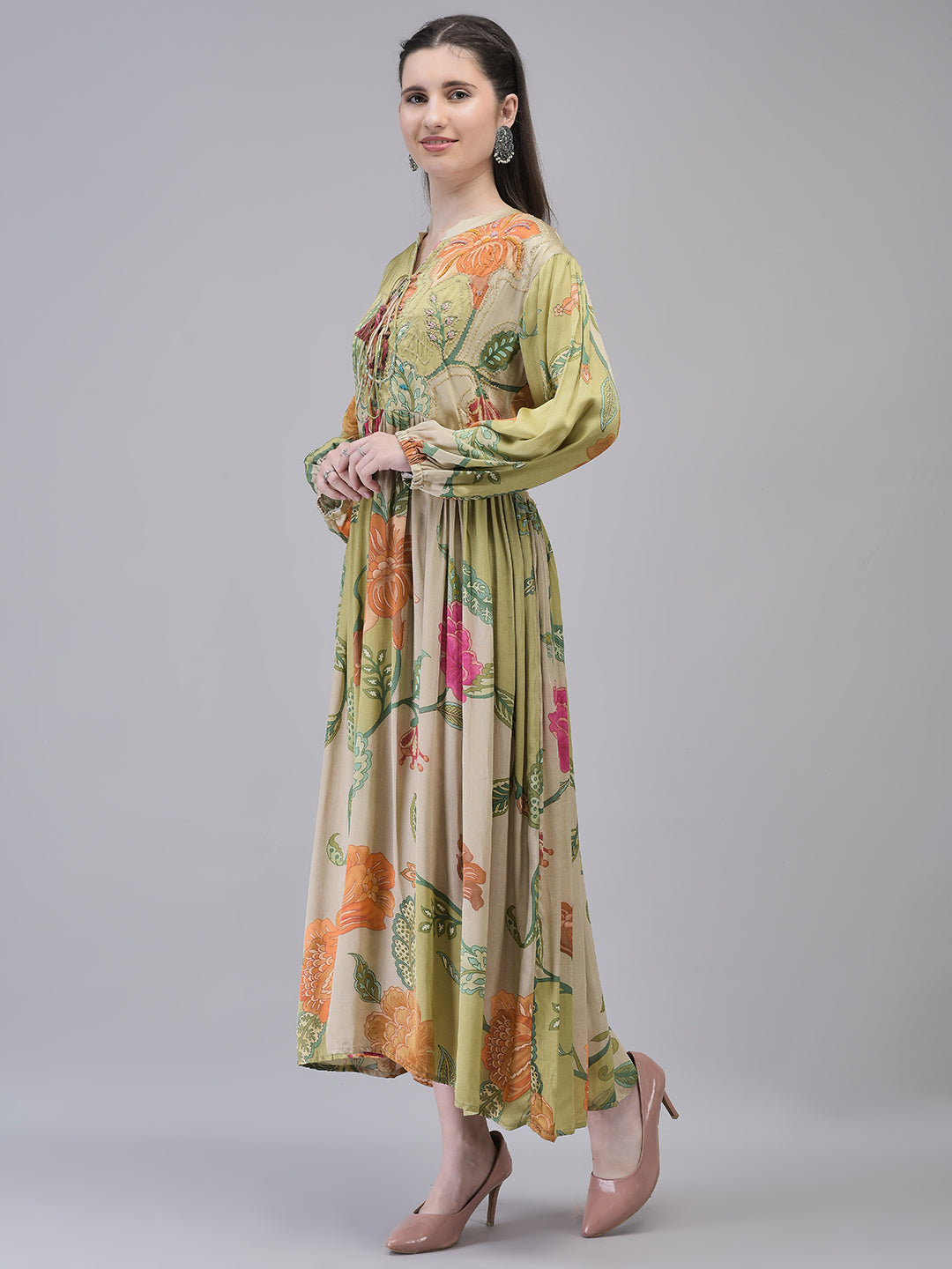 Women's Muslin Green Printed Dress | Long Printed Dress with Embroidery