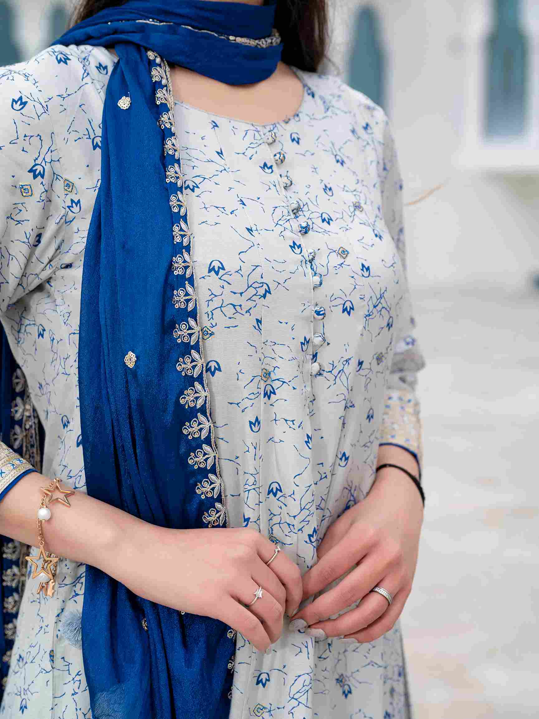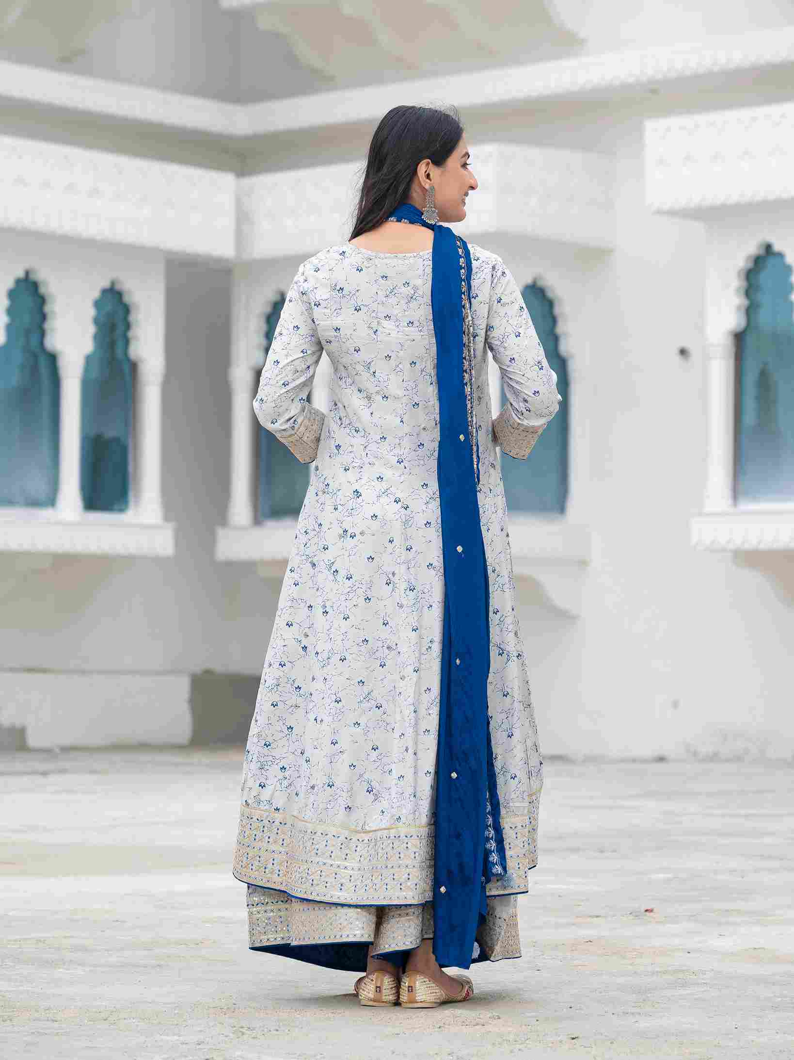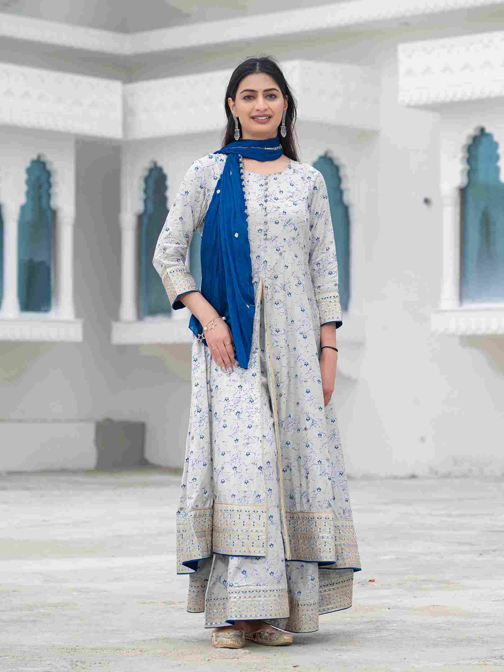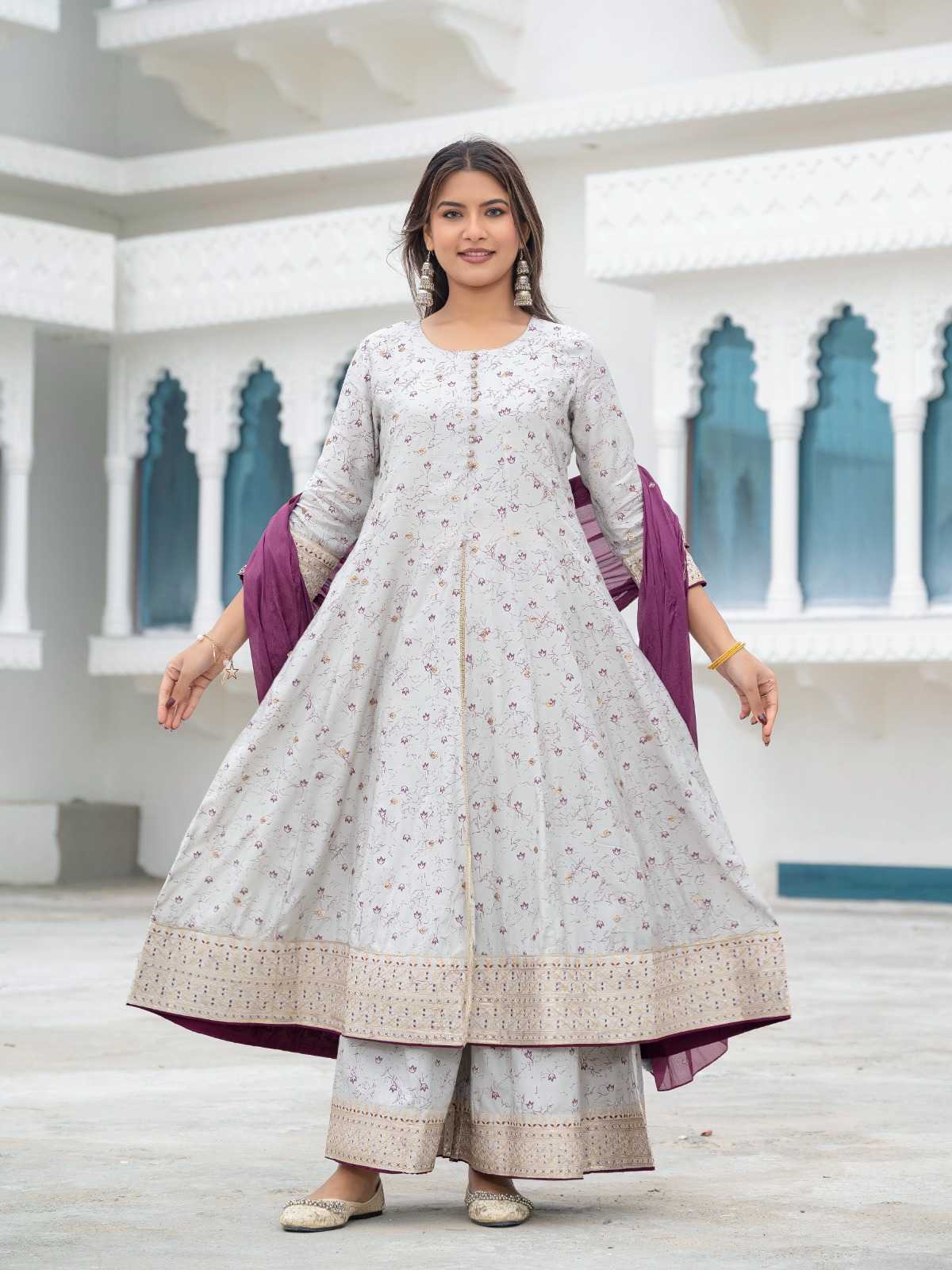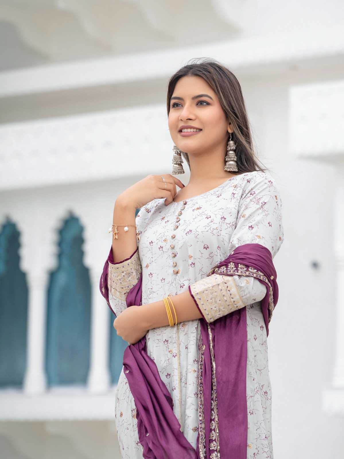 Elevate your ethnic wardrobe with this elegant muslin printed suit set, featuring delicate floral patterns and intricate ethnic embroidery. The set includes a stylish front-split kurta, matching palazzo pants, and a contrasting magenta dupatta with embroidered borders. Crafted from soft muslin fabric, this outfit offers a perfect blend of comfort and sophistication, ideal for festive occasions, family gatherings, or casual ethnic outings. A must-have ethnic suit set for a graceful traditional look.