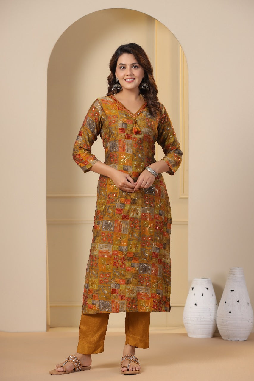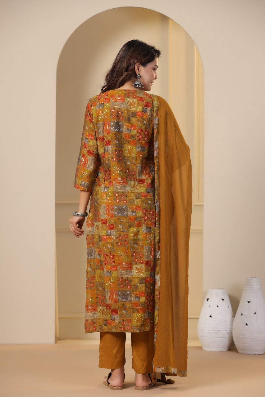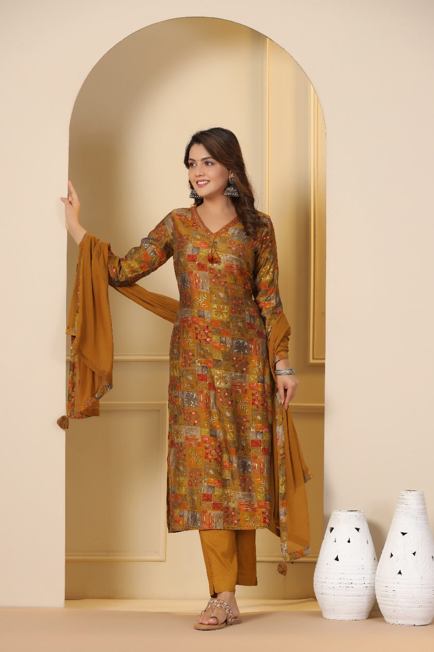 Elevate your ethnic style with this elegant Mustard-Brown Modal Suit Set, crafted from soft, breathable modal fabric. The kurti features intricate thread embroidery, paired with a matching bottom and printed dupatta for a complete, graceful look. Perfect for festive occasions, family gatherings, or stylish everyday wear, this suit set blends tradition with comfort. Its rich mustard tone and refined detailing make it a standout choice in women’s ethnic wear. A must-have addition to your wardrobe.
