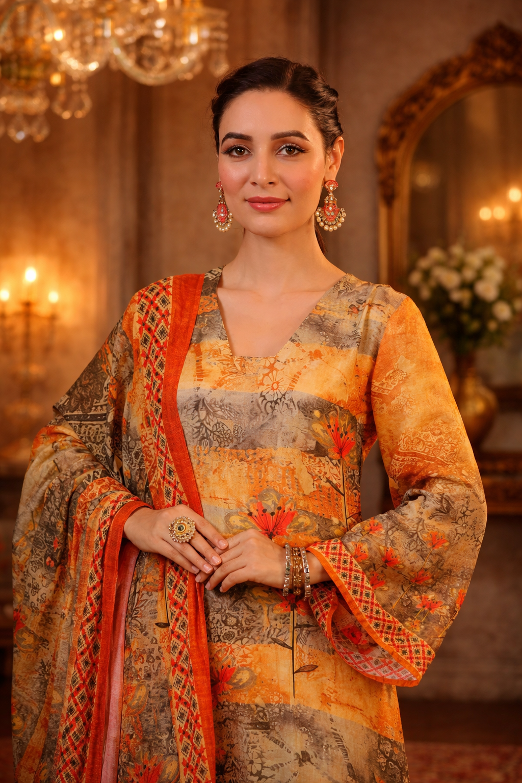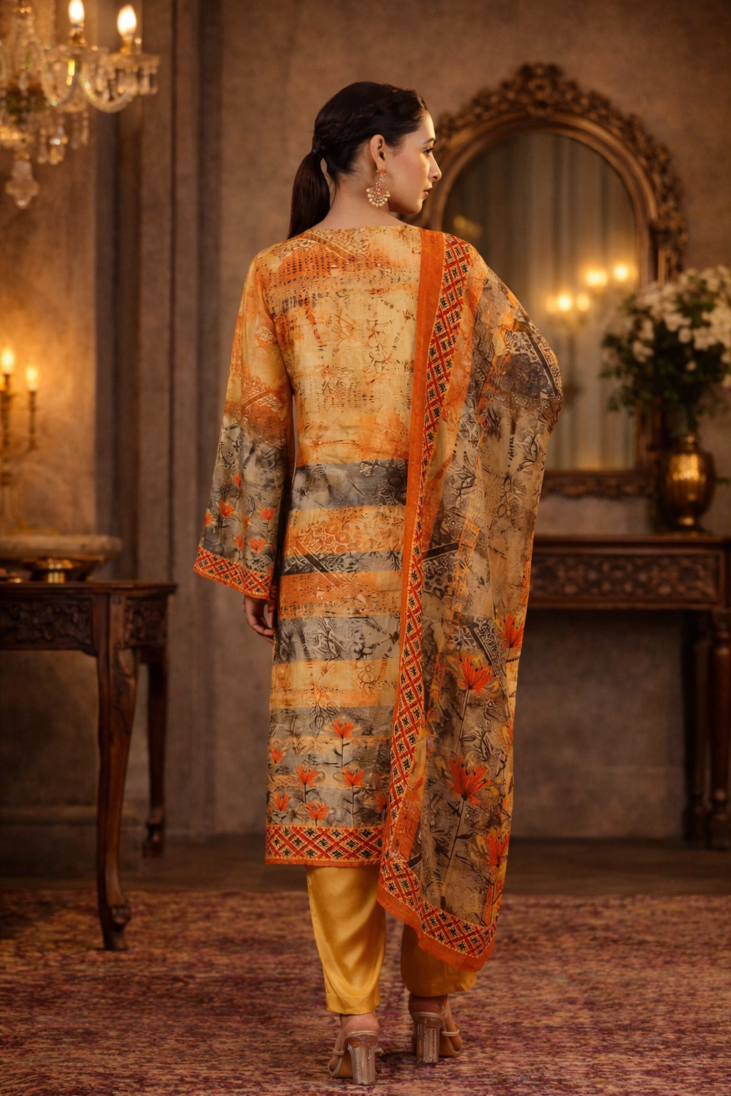 Step into timeless elegance with this beautifully crafted kurta set, featuring a warm palette of amber, rust, and soft floral prints. Designed with a classic straight-fit silhouette, the kurta is paired with subtle yellow bottoms and a richly detailed dupatta that adds a regal touch. Perfect for festive gatherings, intimate celebrations, or elegant daywear, this ensemble blends comfort with heritage-inspired charm.