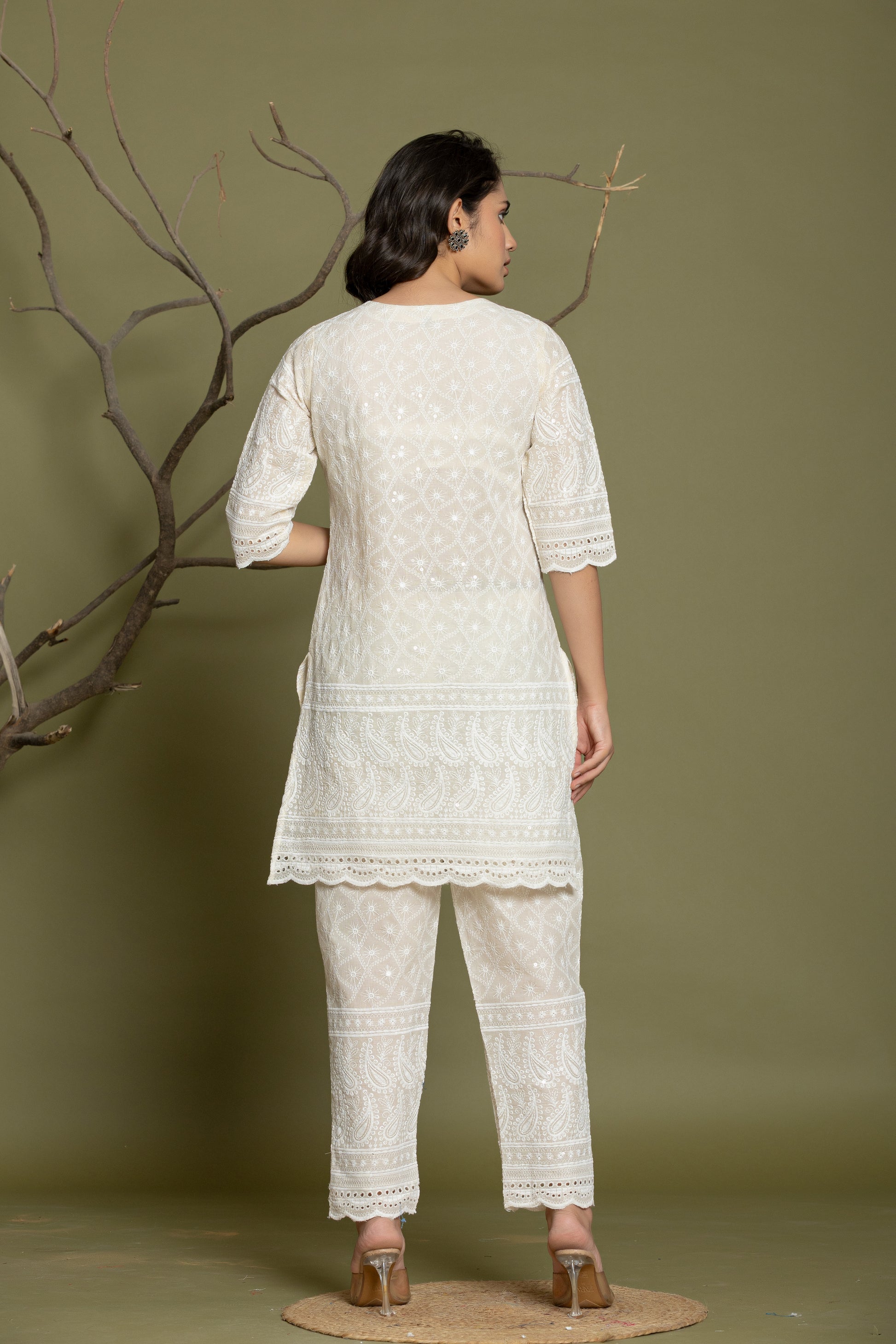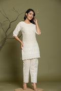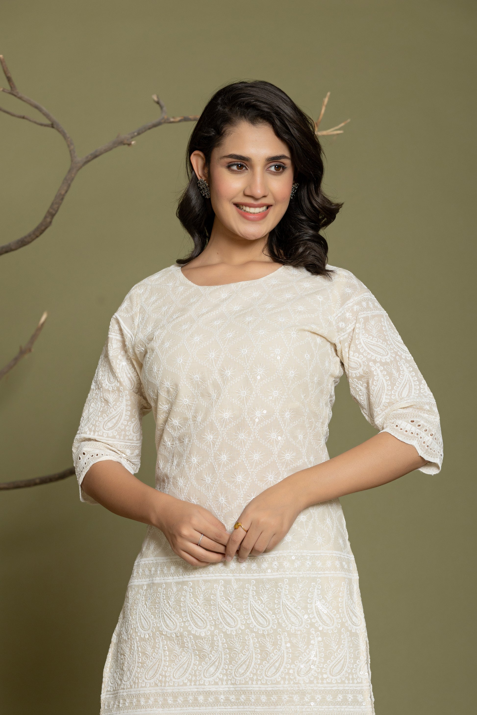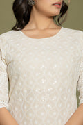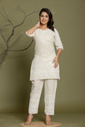 Women's Off-white Cotton Fabric Ethnic Kurta Set with Thread work
