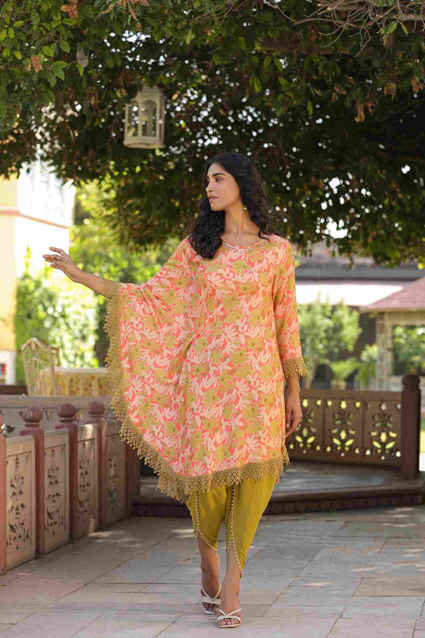 Elevate your ethnic wardrobe with this sophisticated peach muslin silk ensemble. The lightweight poncho features intricate printed detailing that showcases traditional craftsmanship, while the coordinating dhoti pants offer a contemporary silhouette. Crafted from breathable muslin silk, this two-piece set delivers comfort without compromising on style. Perfect for festive occasions, cultural celebrations, or elevated casual wear, the combination creates a refined look that bridges heritage and modern fashion sensibilities.