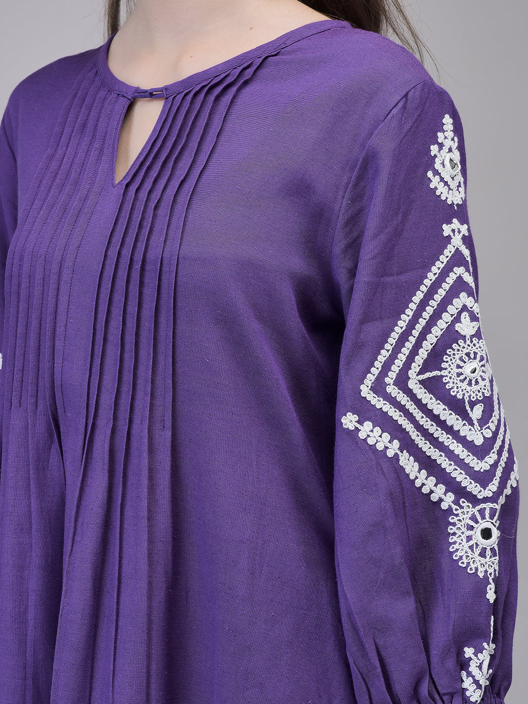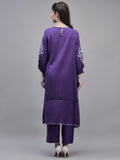 Step into timeless elegance with this Purple Rayon Kurta Set, designed to make heads turn. Crafted from soft and breathable rayon fabric, this ensemble offers unmatched comfort with effortless grace. The kurta features delicate pintuck detailing on the front, a subtle keyhole neckline, and beautifully embroidered sleeves with intricate white patterns, adding a touch of ethnic charm.