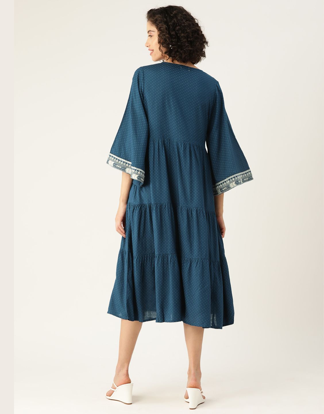 Add elegance to your everyday look with this women's blue embroidered rayon midi dress, designed in a breezy A-line flared silhouette. Crafted from soft rayon-slub fabric, it features intricate thread embroidery, a stylish tie-up neckline, and graceful bell sleeves that enhance its feminine charm. Whether it’s a casual day out or a semi-formal occasion, this blue embroidered midi dress is a perfect blend of comfort and ethnic chic.