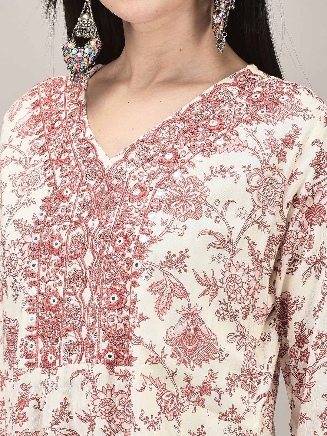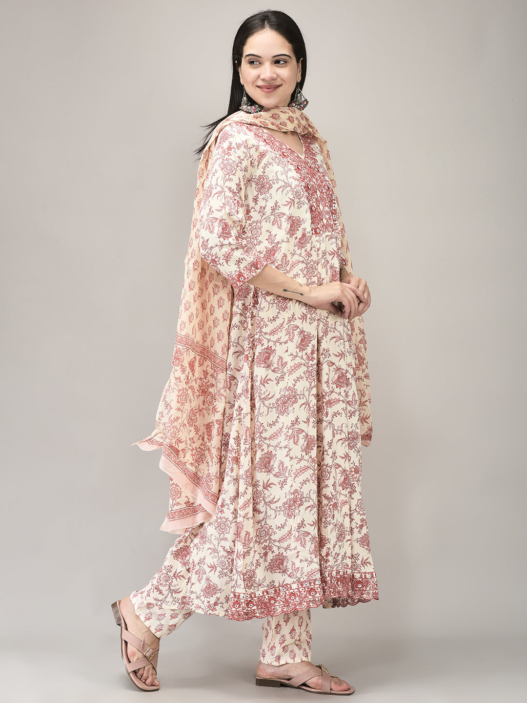 Women's Rayon Pink Printed Suit set | Ethnic Flared Kurta with Printed Pant & Dupatta