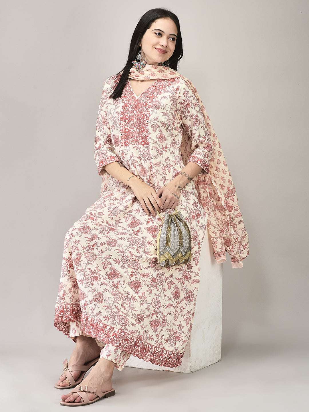Add a touch of elegance to your wardrobe with this Pink Rayon Printed Suit Set, crafted from soft, breathable rayon fabric. The flared kurta showcases intricate prints, complemented by matching pants and a coordinating printed dupatta for a cohesive look. Ideal for casual outings, festive gatherings, or stylish daywear, the vibrant pink hue and comfortable fit offer both charm and ease. A versatile ensemble that seamlessly blends traditional charm with contemporary style—perfect for women’s ethnic wear.