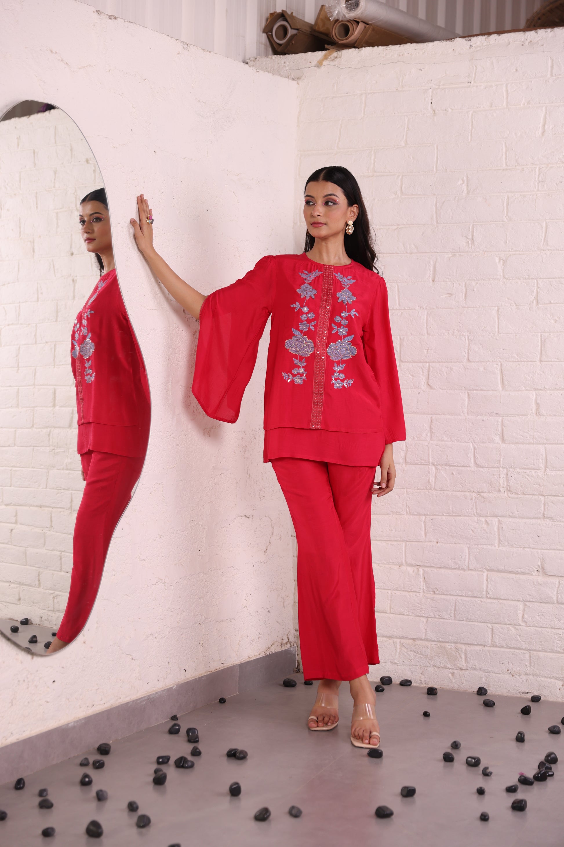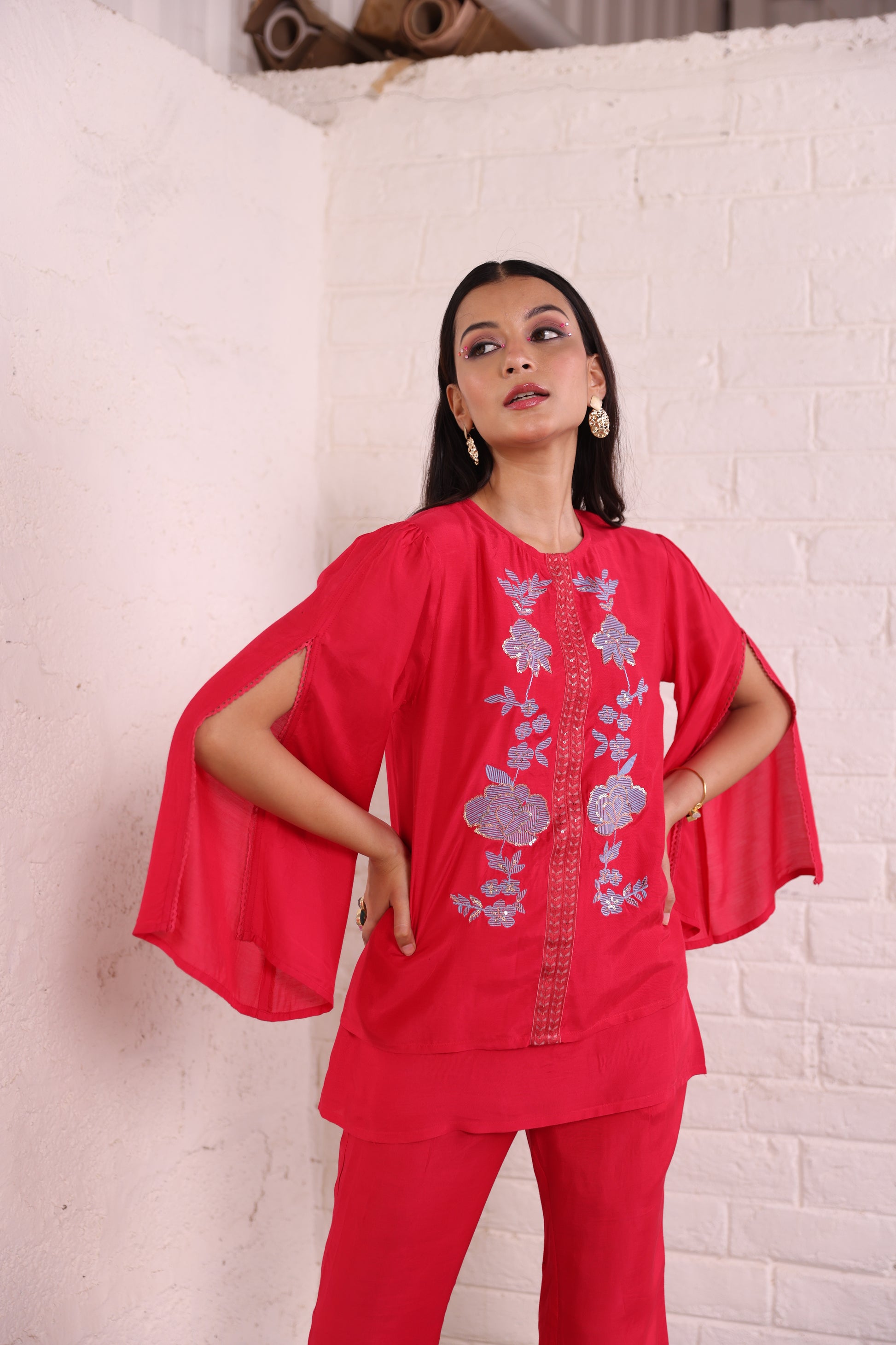 Elevate your wardrobe with this red santoon fabric tunic top featuring elegant split sleeves and intricate floral embroidery on the front. The soft, flowy santoon fabric ensures a comfortable fit while adding a graceful drape to your silhouette. Ideal for festive gatherings or semi-formal occasions, this embroidered tunic top for women blends tradition with a modern twist.