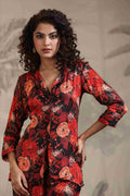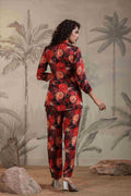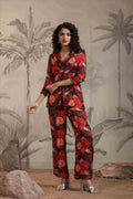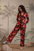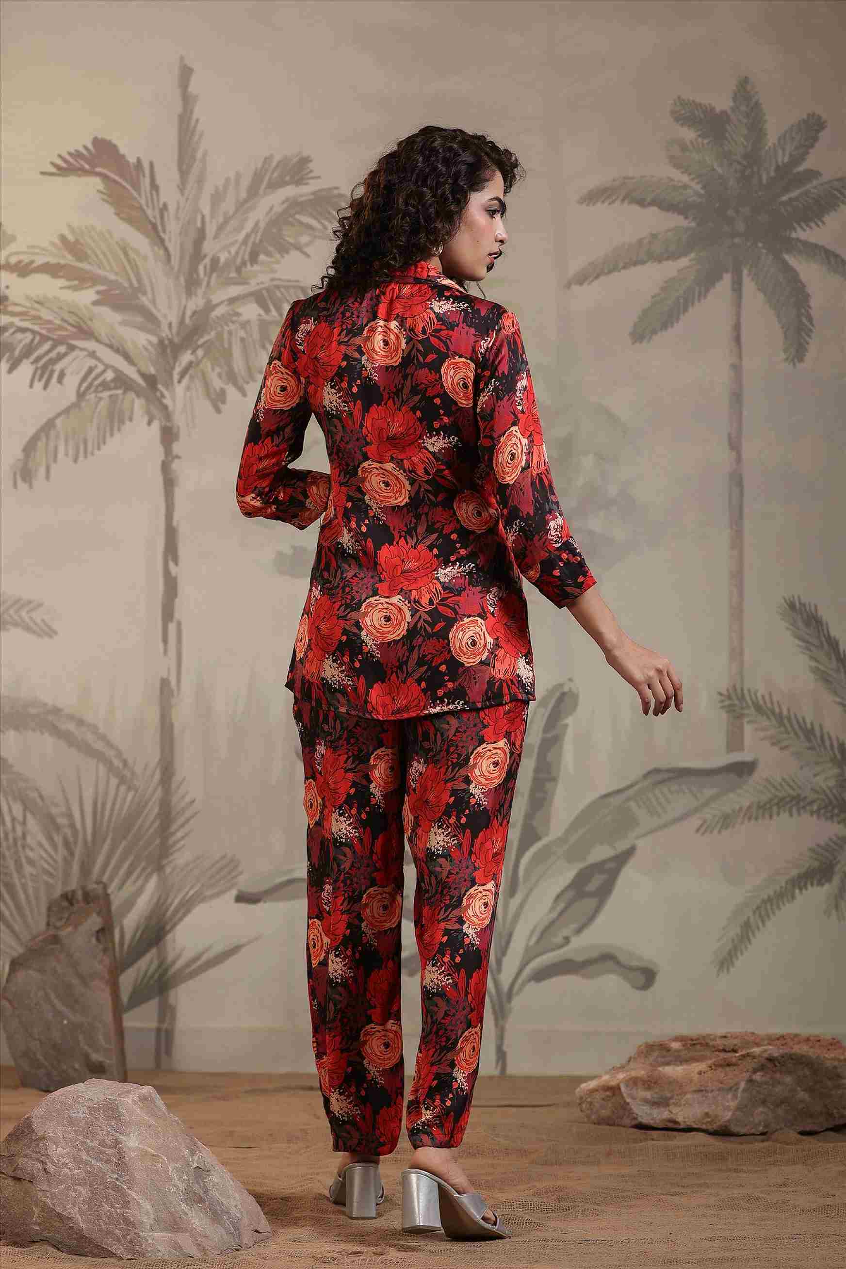 Make a bold and beautiful style statement with this black floral satin fabric co-ord set, designed for the modern woman who loves elegance with a touch of drama. This stunning set features a blazer-style top with a flattering V-neckline and front buttons, paired effortlessly with matching straight-fit pants. The rich floral print in red, orange, and black hues adds a vibrant and captivating appeal.