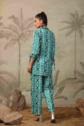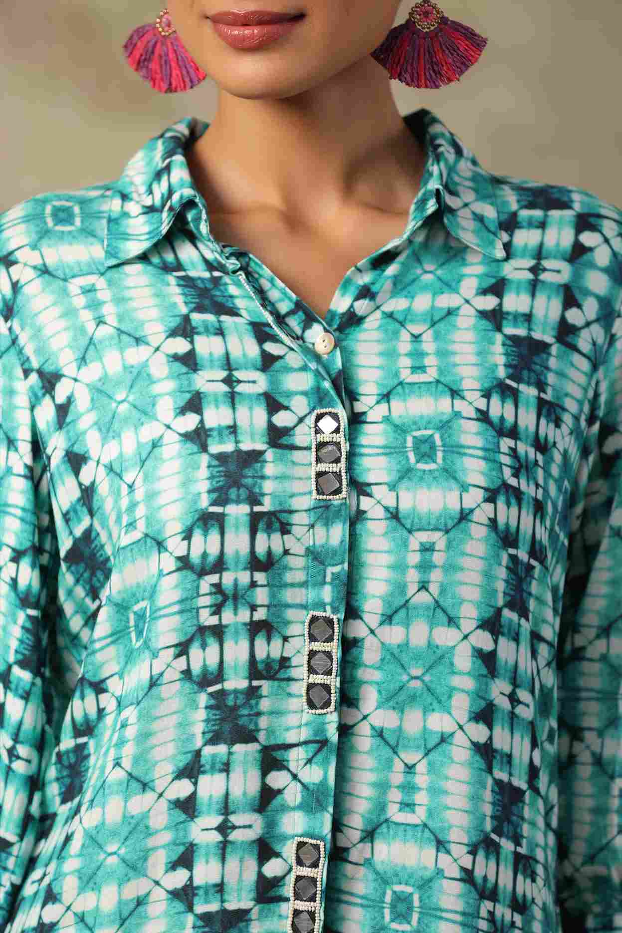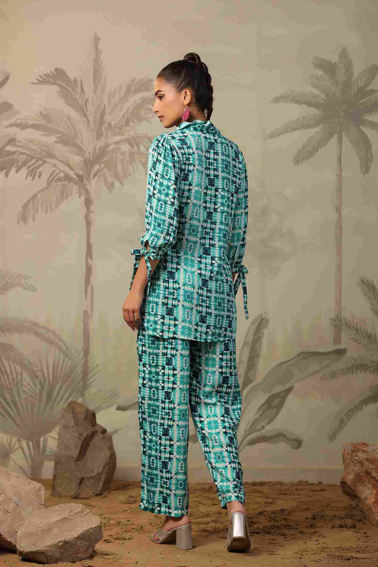 Add a pop of vibrance to your wardrobe with this turquoise rayon fabric co-ord set, a perfect blend of comfort, charm, and modern flair. Crafted from soft and breathable rayon fabric, this stylish set features a collared button-down shirt with eye-catching sequin work on the placket, adding a subtle hint of sparkle. The abstract geometric print in shades of turquoise and white gives it a lively appeal, while the adjustable tie-up sleeves and relaxed-fit pants enhance both comfort and trend.