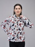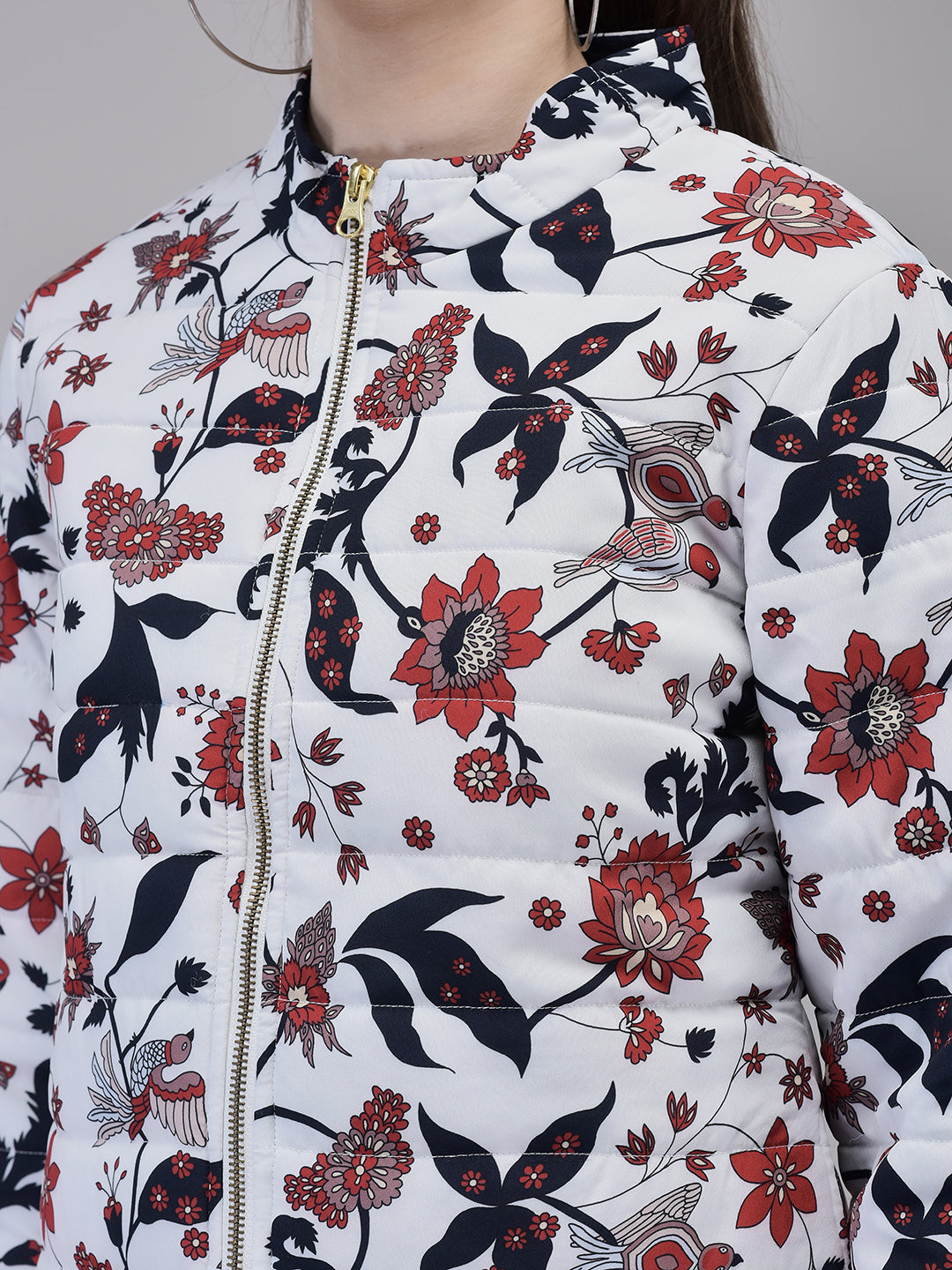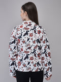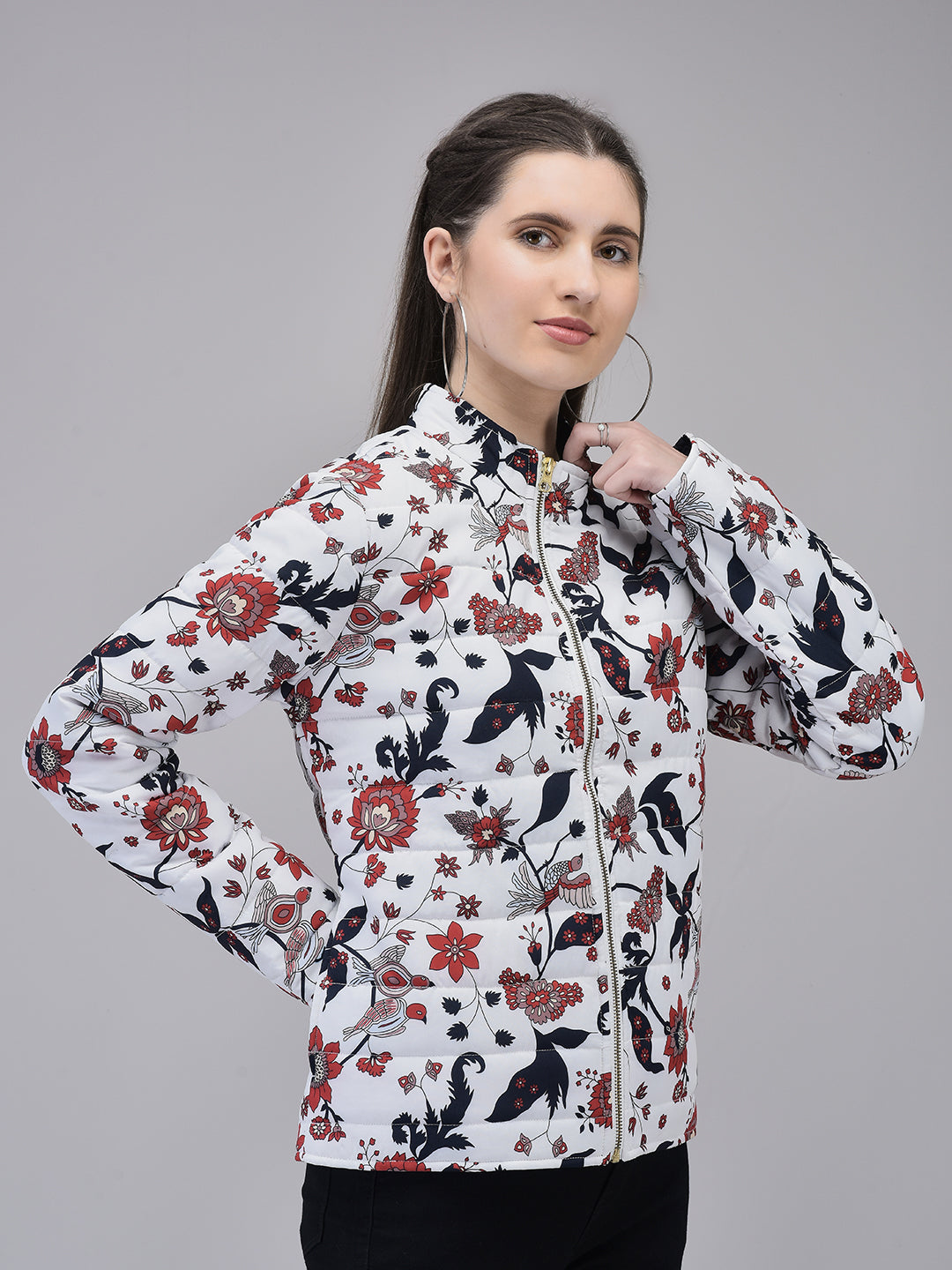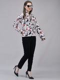 White Poly-Silk Puffed Printed Jacket for Women—Stylish Lightweight Casual Outerwear.